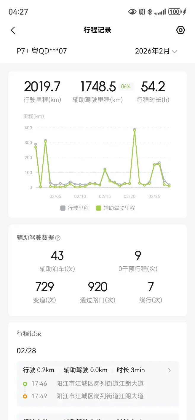 2月收官,我的小鹏P7+交出了一份兼具实用性与经济性的用车答卷。整月累计行驶2019.7公里,覆盖城区通勤、高速跨城等多元场景(深圳阳江往返,珠海阳江往返,中山阳江往返,到乡下老家往返,春节高速严重堵车等),从智驾的高可靠性,到电耗的稳定性,再到极致的用车成本,每一项数据都彰显着新能源出行的核心优势。