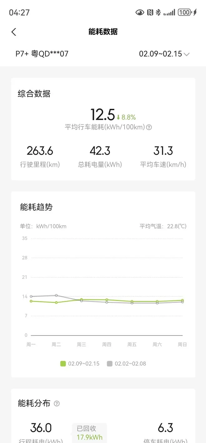 - 02.09-02.15:平均车速降至31.3km/h,电耗低至12.5kWh/100km;