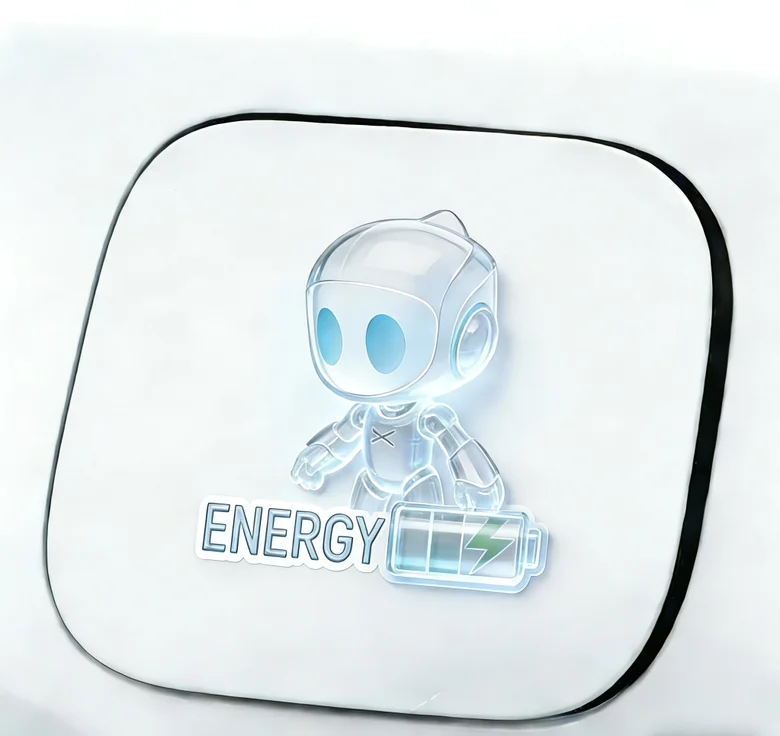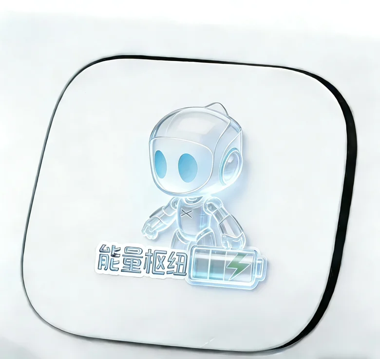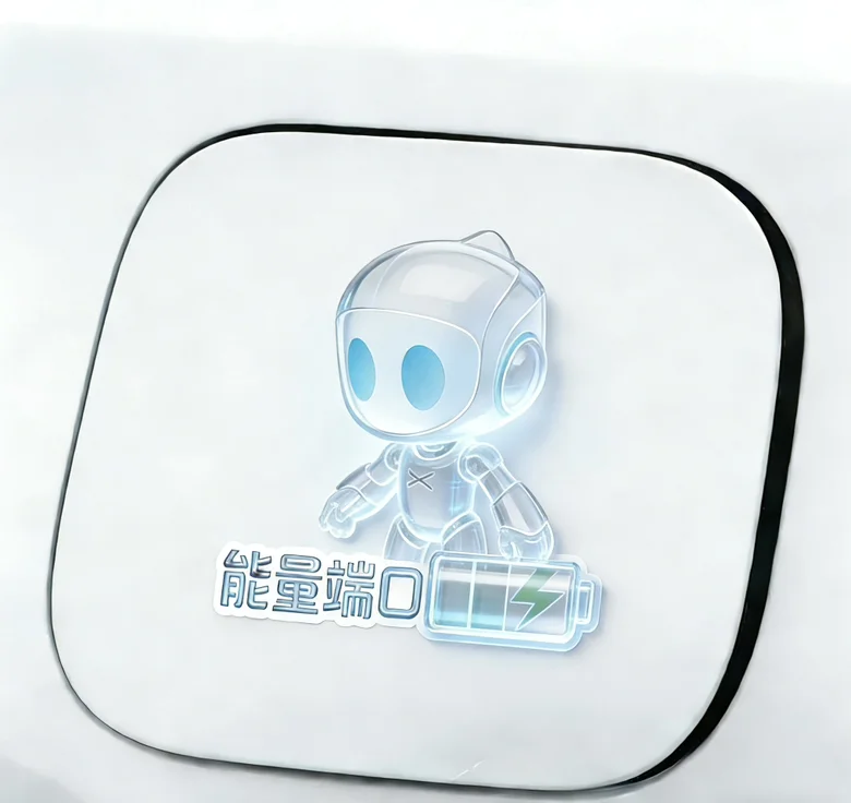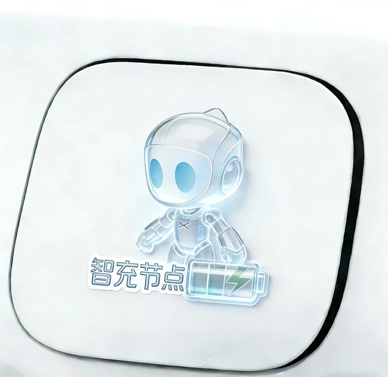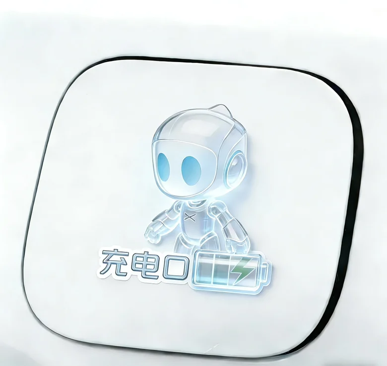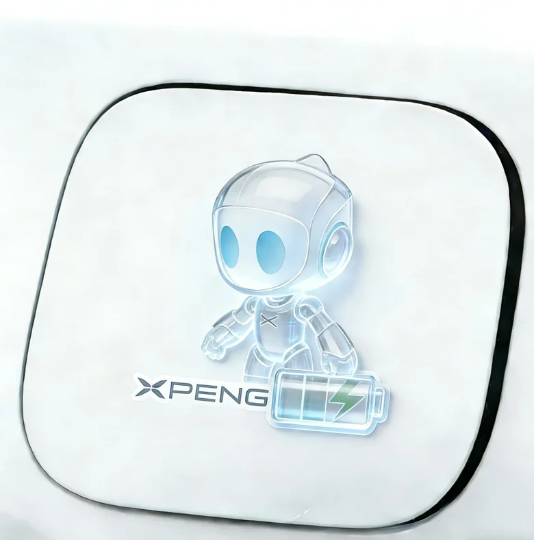 本款充电口贴纸以小鹏标志性小P机器人为核心,采用半透明全息质感重塑品牌IP,通透材质与流动光效营造出“数字精灵”的未来感,与车身设计语言高度契合。