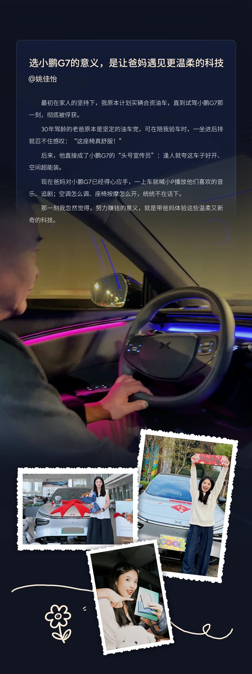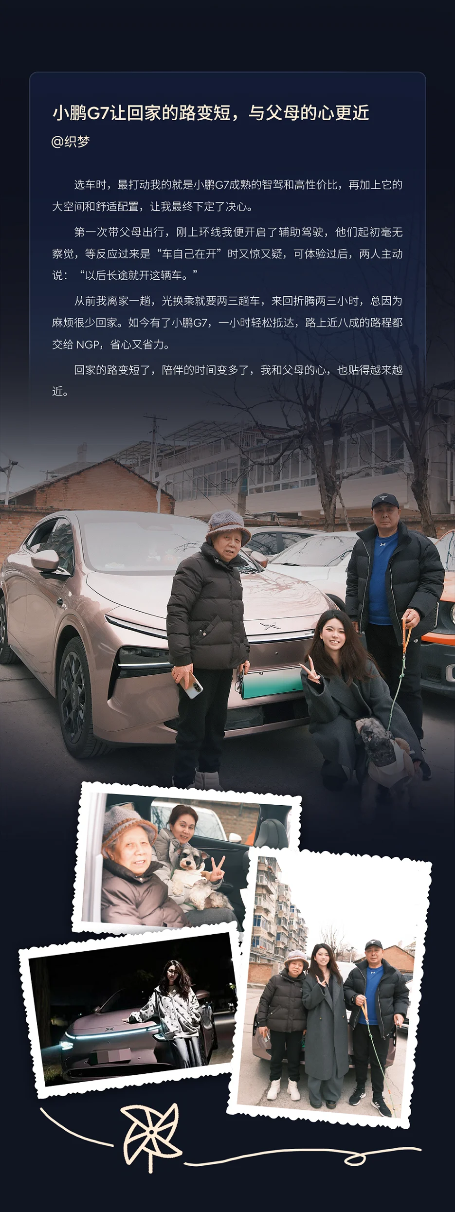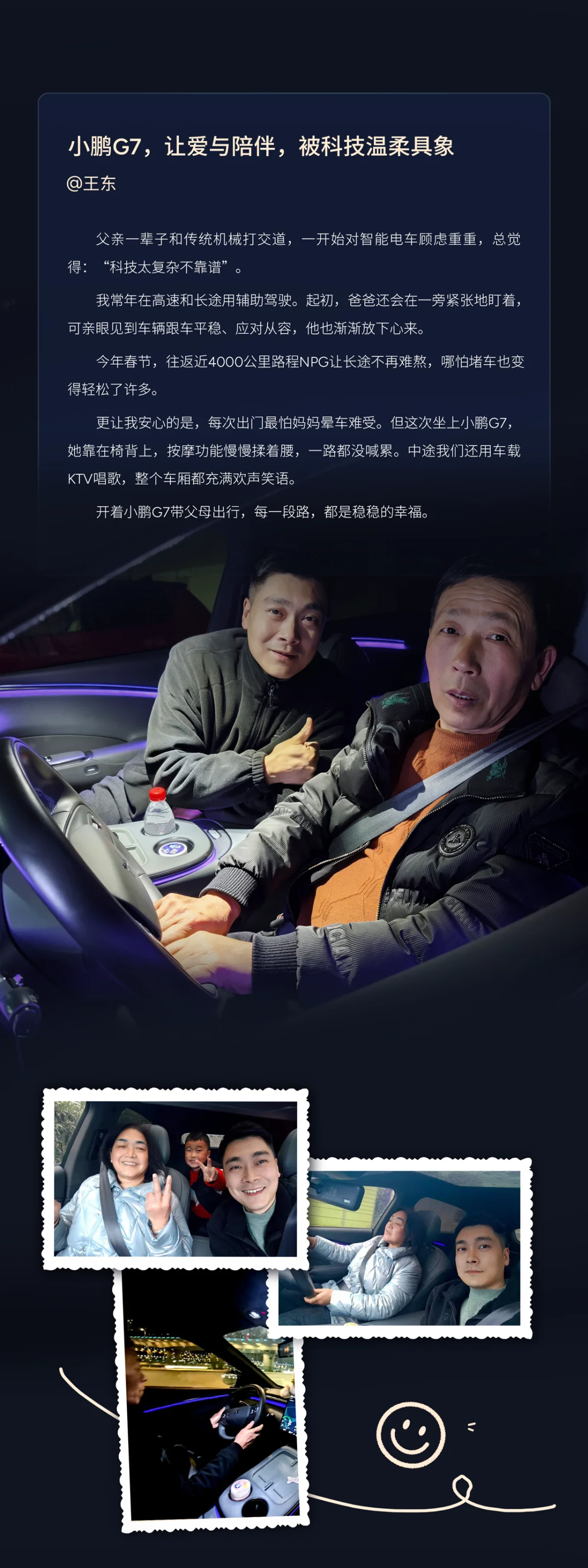 在小鹏G7车主的故事里,最动人的不是智能驾驶的参数,而是父母体验时的那声惊叹。 四位车主,带着父母,开上了小鹏G7。用语音点一首老歌,用辅助驾驶让长途更轻松,一起看沿途的风景,聊过去的事——让“时代时差”变成“同频共振”。 让科技走进父母的生活,是陪他们熟悉新功能,也是看着他们开着G7,去往自己想去的方向。父母或许不懂什么是OTA,但他们比谁都懂,每一次出发的意义。