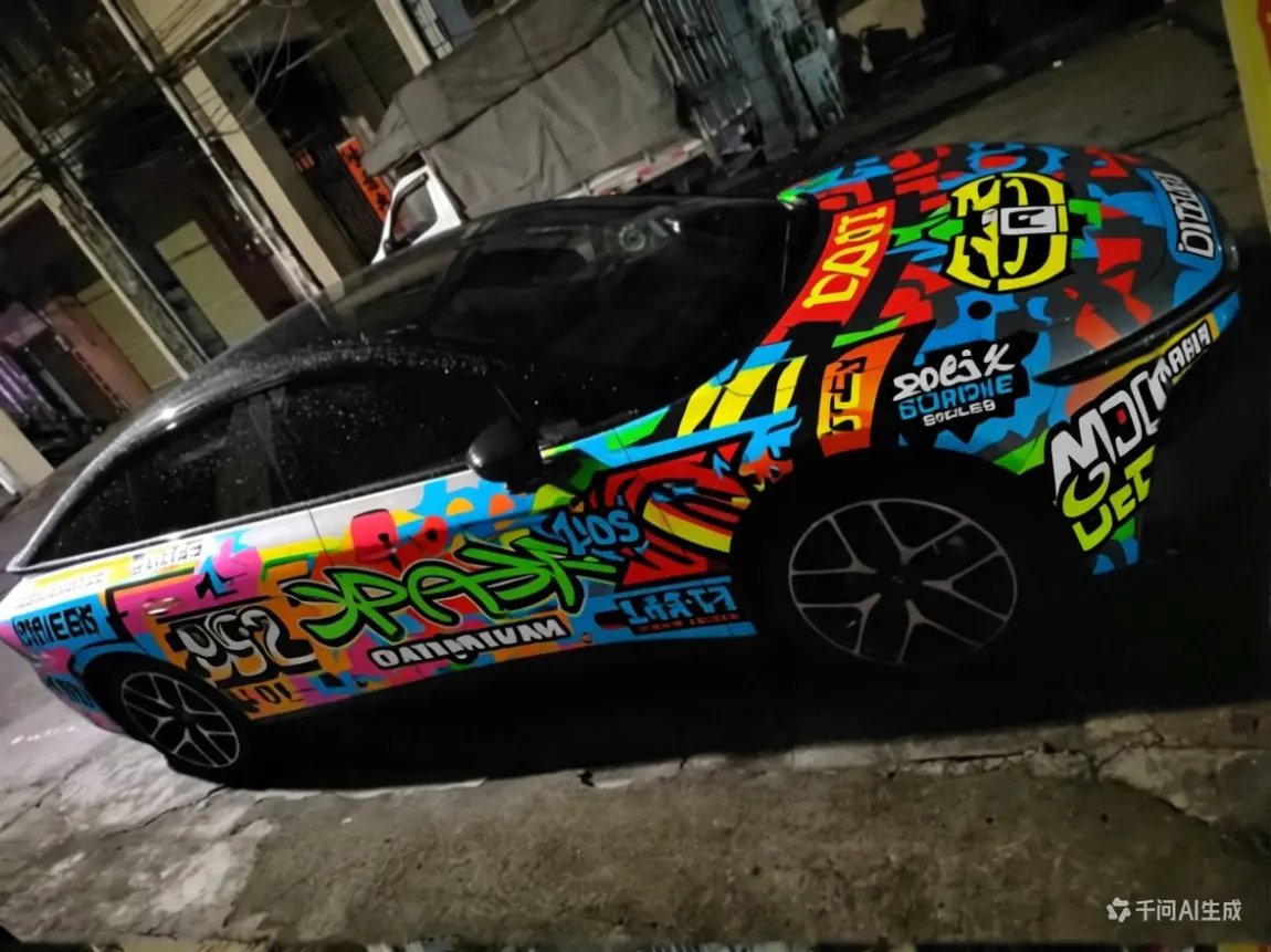 我叫千问帮我设计一些实用的车贴,结果它把整部车贴了,还怪好看的咧,涂鸦车贴,看着好眼花,其实我不怎么懂这次的活动,是要创作小的车贴,还是车衣这样的车贴。