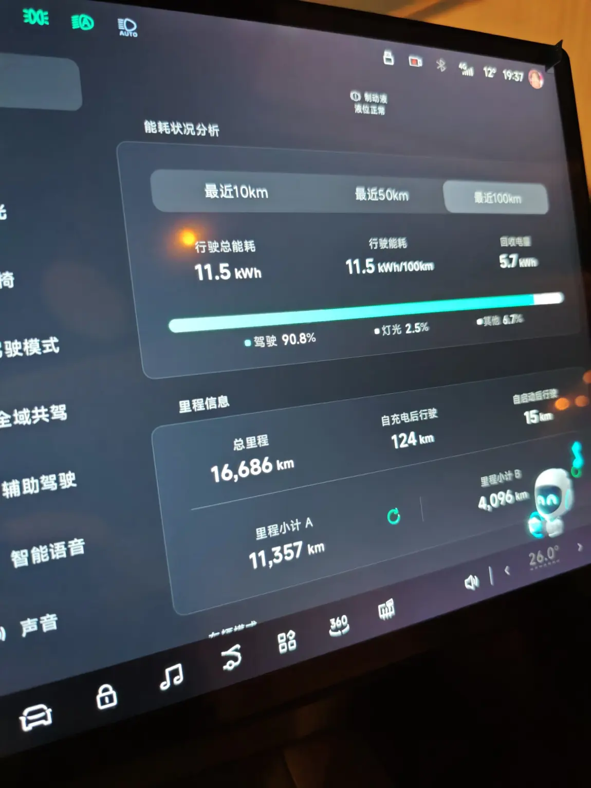 现在春天气温回升了,电耗能控制在11~12之间了,如果感觉早上气温低可以提前打开座椅和方向盘加热,很方便。