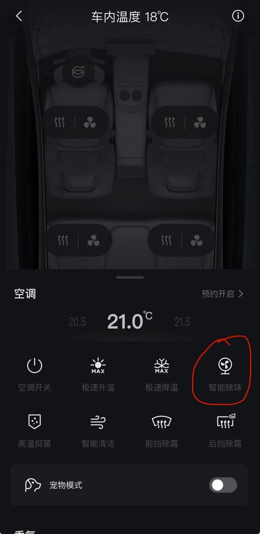 春天细雨连绵 潮湿天气开空调后 停车记得开15分钟的智能除味,可远程小鹏App里面操作,这样以后空调不容易产生异味,车内空气一直清爽