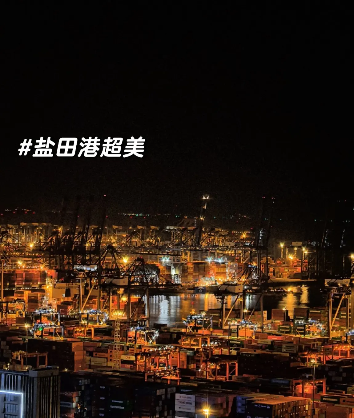 夜晚的盐田港灯火璀璨,集装箱与吊臂在夜色中勾勒出工业美学,随手一拍都是大片。