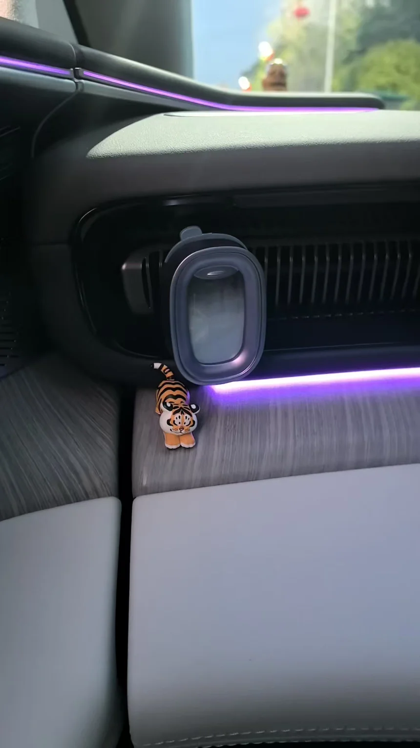 • 出风口的小惊喜:在空调出风口旁,一只小胖虎正慵懒地趴着,橙黑相间的条纹在淡紫色氛围灯的映衬下,显得格外俏皮。旁边的网易严选小飞窗香氛,温感变色的设计随着车内温度悄然变化,为旅途带来清新的气息。