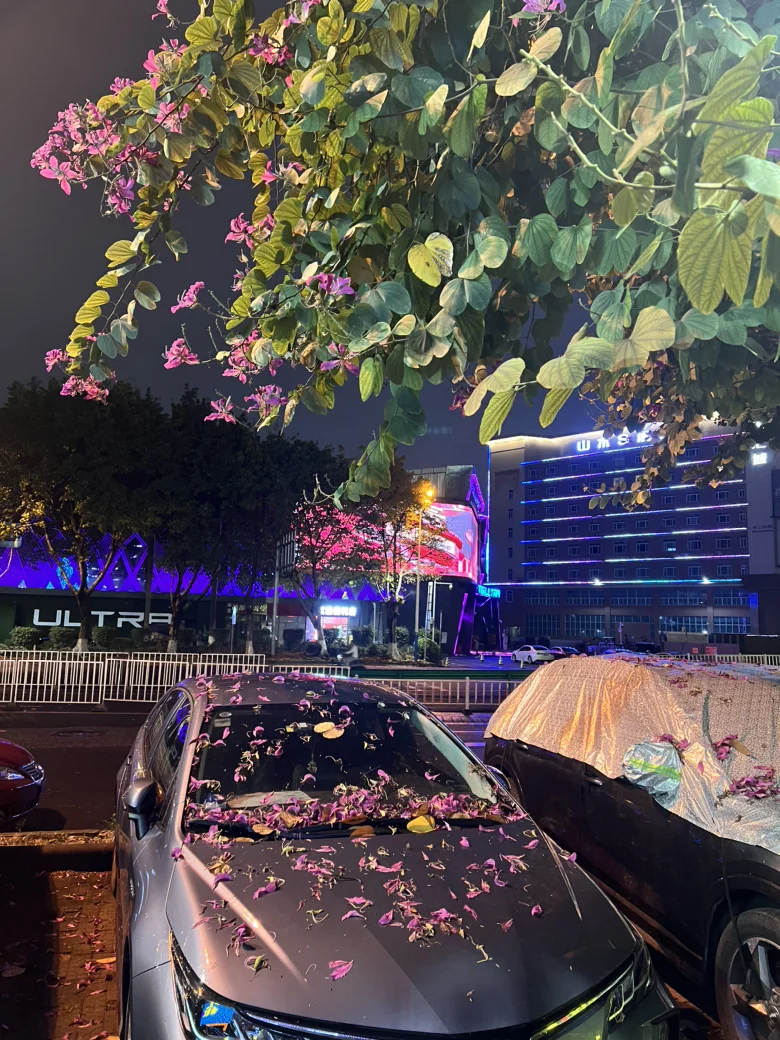 最是三月初的雨,不肯爽爽快快地下,也不肯彻彻底底地停。它像极了写了一半的诗句,悬在半空,欲说还休。空气能拧出水来。但鹏友们尽量避免把爱车停在树底下哦,不然你就会收获满满的花瓣啦。