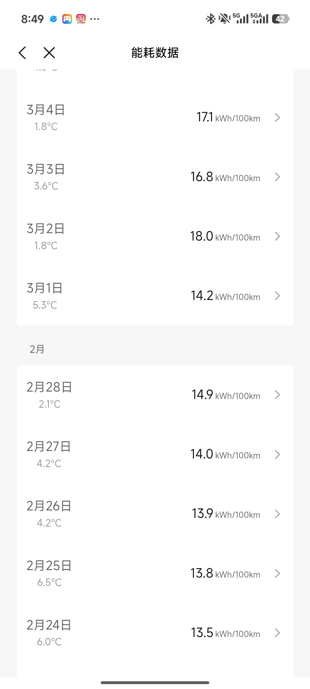 春天到来,温度慢慢回升,小鹏的能耗越来越低,平均两三度的气温,能耗可以降到13左右,开起来真的太舒服了