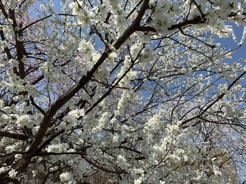 春日花情实况播报:我身边开得最旺的就是桃花和杏花,还有少量的山杏。大青山基本都是桃花、杏花,因为三道沟盛产桃子。花期现在(3月中下旬到4月初)正是盛花期,再过半个月左右就会慢慢谢了。