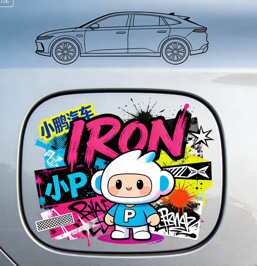 #鹏友共创# 创作理念:这款车贴采用潮流涂鸦拼贴风格,将小鹏车型拆解为充满街头感的几何块面,IRON标识以喷漆字体形式穿插其中,错落排布充满视觉张力。高饱和撞色适配油箱盖的方寸空间,完美契合年轻鹏友的个性审美,把爱车变成移动的潮流名片,让每一次出行都带着独属于自己的街头态度,成为值得珍藏的出行记忆。