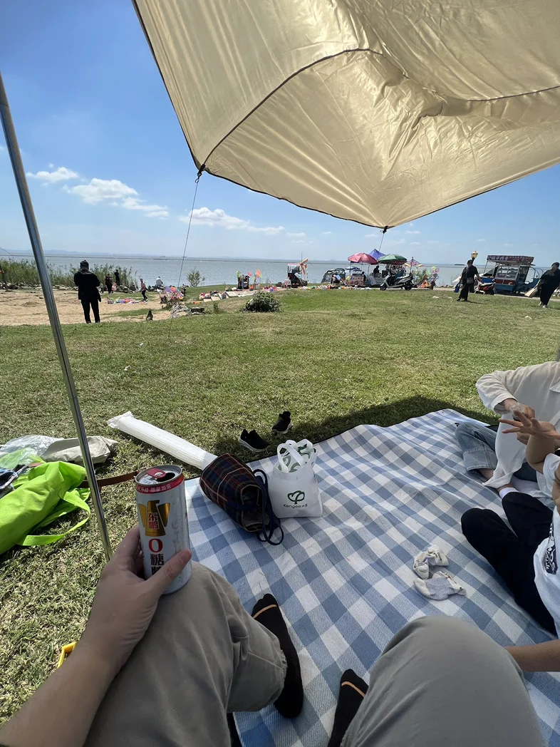 3. 露营天幕下(图3):不用刻意摆拍,就自然地坐在野餐垫上,手里拿着一罐我爱喝的东鹏特饮(好喝提神)饮料,或者和朋友互动。掏出手机,0.5倍广角,视线和风景融合,这种松弛感的照片,最能体现春天的惬意。