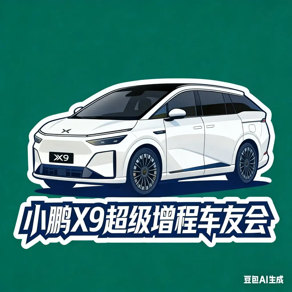 #鹏友共创# 主体元素:以小鹏X9超级增程车型轮廓作为核心,搭配简约线条勾勒出的充电标识,直观展现车型特质。2. 配色方案:采用品牌标志性的科技蓝作为主色调,搭配银色点缀,凸显新能源车型的科技感与未来感。3. 文字设计:加入“X9超级增程车友会”字样,字体棱角分明,呼应车型硬朗外观,增强辨识度与归属感。