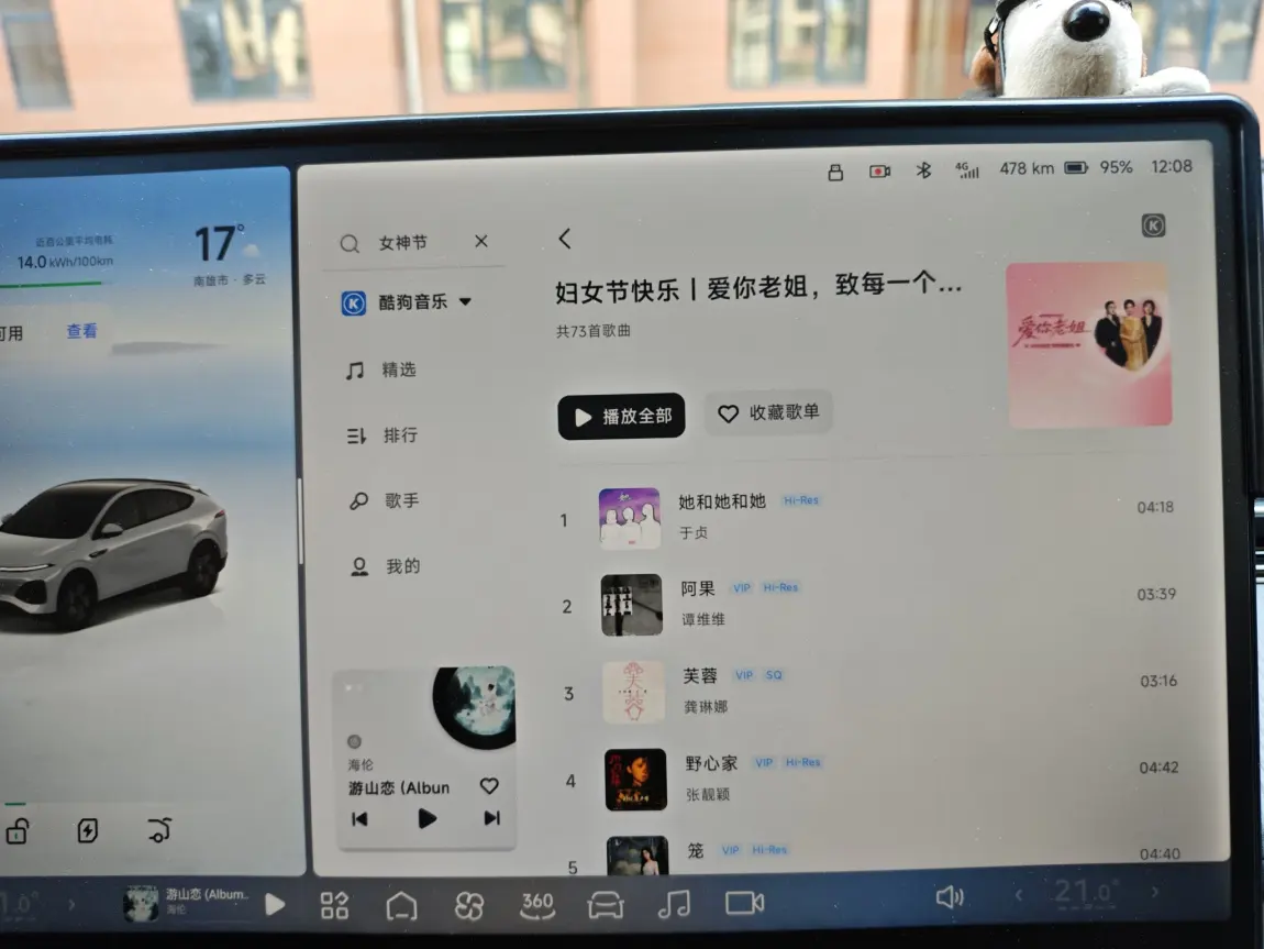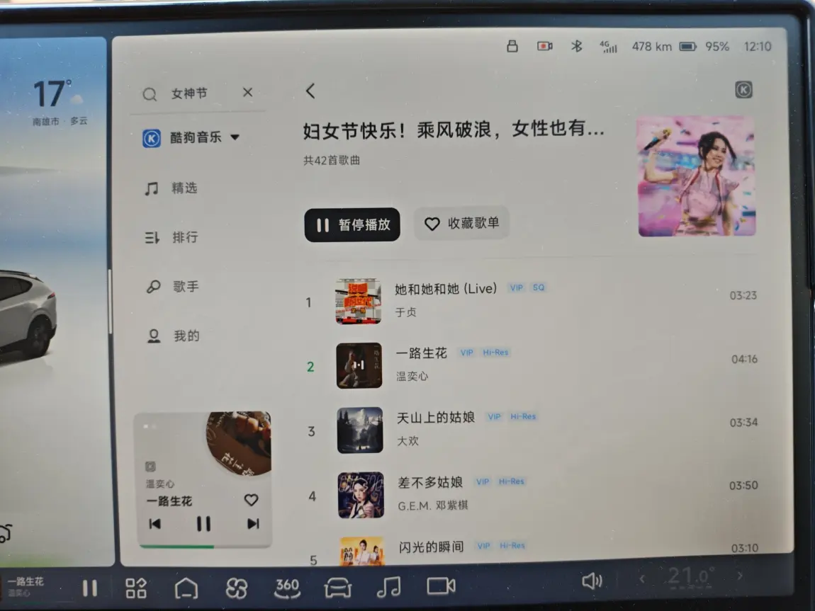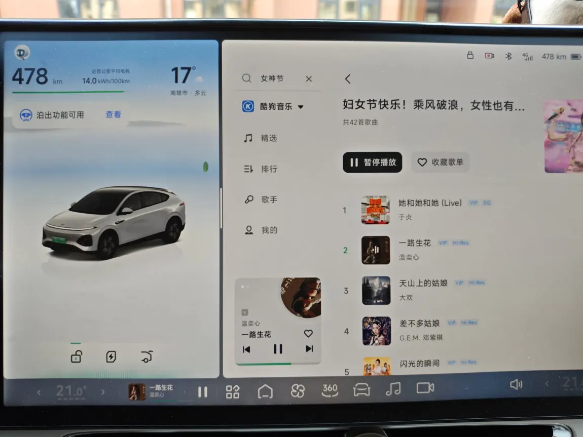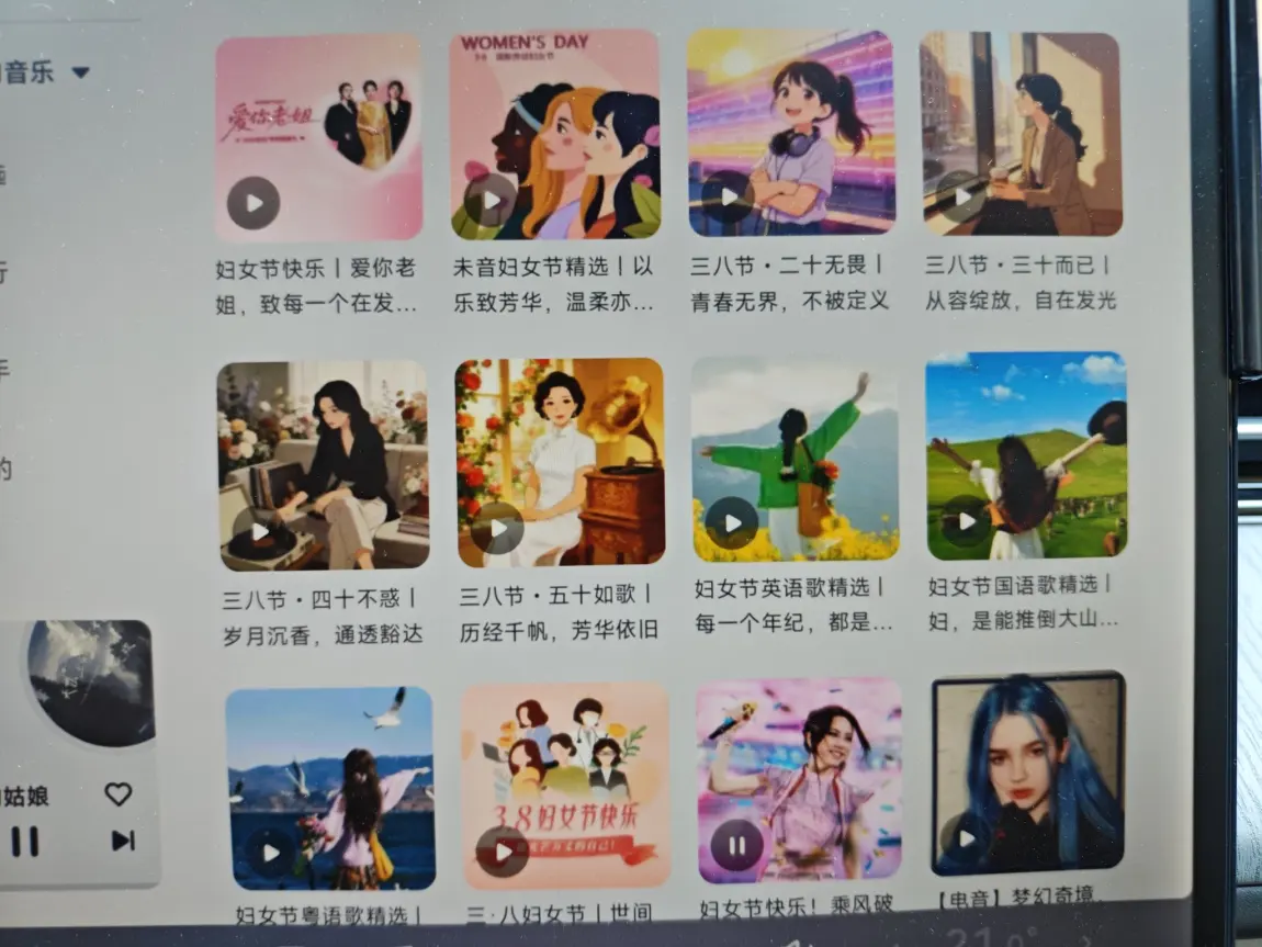 最近发现车机酷狗音乐上线了女神节限定歌单,温柔女声、治愈旋律、力量感曲目全都有,非常适合春日通勤与踏青出行。搭配小鹏智慧场景,设置上车自动播放,一开门小 P 就会温柔问候,氛围灯同步亮起,歌单自动响起,不用动手操作,全程沉浸式享受。不管是日常代步,还是开去郊外赏花,伴着温柔的旋律出发,心情瞬间被点亮。