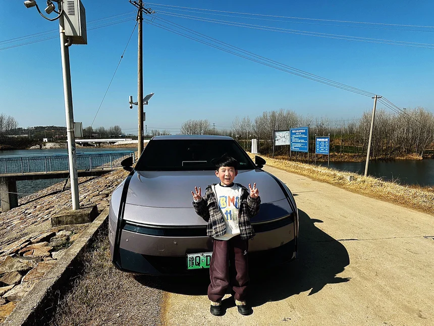 路过一处油菜花田时,我忍不住停下车。金黄色的花海在晚风中翻涌,像是大地铺开的锦缎 。我摇下车窗,给熟睡的儿子拍了张照片,顺便也给我们的P7拍了一张——银色的车身在花海的映衬下,像一艘刚归航的船,安静地停泊在春天的岸边。