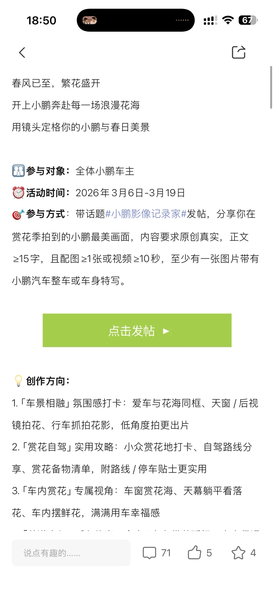 低碳出行,从每一次通勤开始。开着小鹏,用更低的能耗奔赴每一场春日之约,一起为春天减碳!