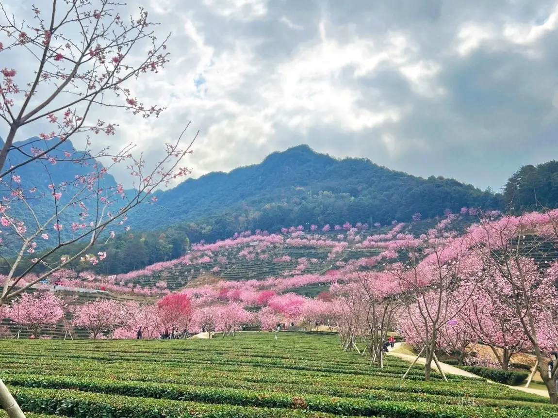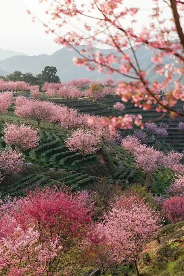 名不虚传,不枉此行!阴那山樱花与茶田层叠交织,粉色、红色樱花次第绽放,花枝交错,花瓣随着春日微风簌簌飘落,真的是好不浪漫哈!