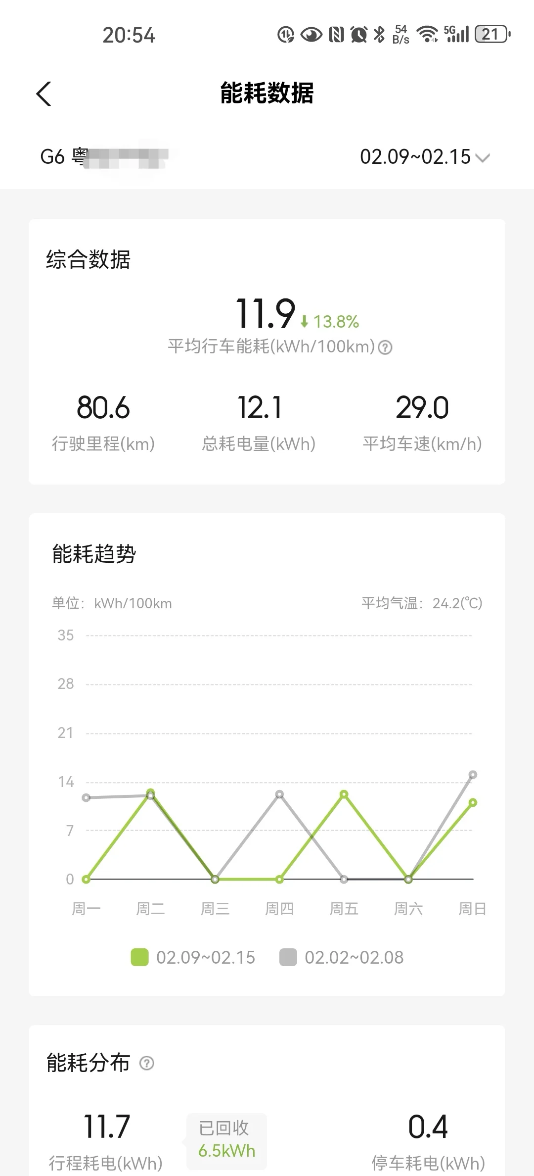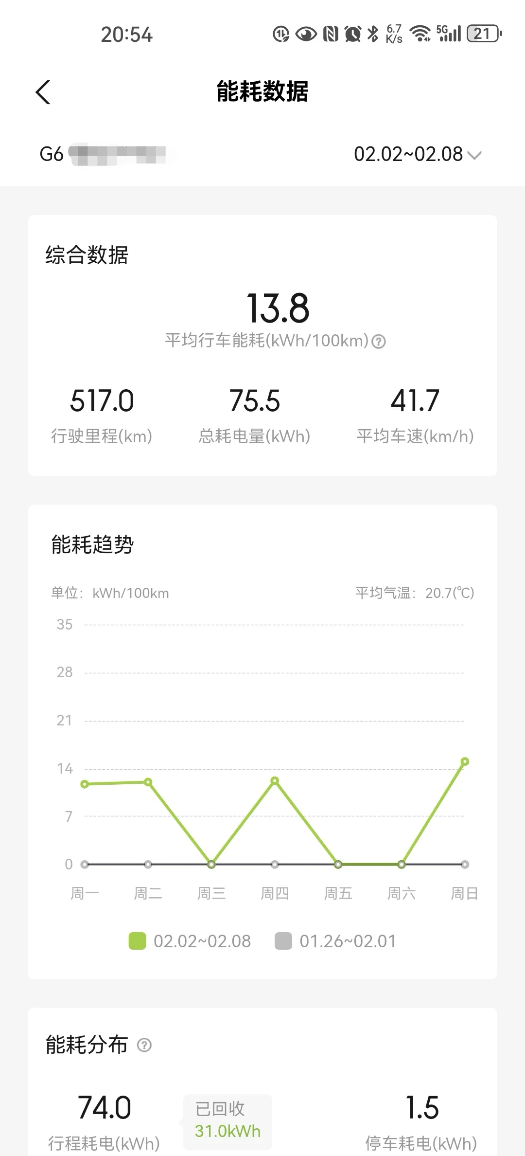 我的G6能耗报告,这个春节开车特别多,对能耗真是深有感触,2月份第一周,我们经常跑高速,感觉上了高速之后能耗也跟车速一样上来了,在高速路上跑还是比较耗电的,当时还是我们家里的十几年车龄的老司机在开,能耗也降不下来,一周平均能耗还是去到了十四左右,后来二月份的第二周是我们自己在开,小年轻,并不喜欢自己开,还是觉得相信科技的力量,经常开NGP,后来再看第二周的能耗报告,居然比我们家的老司机还省,不得不说,NGP还是很省电的哈哈,不仅开的好,也开的省!总体感受下来,堵车必耗能,踏板越踩越耗电!