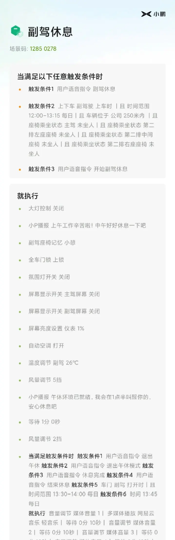 #玩转智慧场景# 小鹏X9副驾女友午休专属场景码 专为副驾女友打造的车内午休神器,上车自动开启舒适模式,告别手动调节!触发后副驾座椅自动后移、后仰放平,开启通风/加热,空调调至舒适温度,氛围灯调暗,车窗升起,安心酣睡。自定义午休时长,到点自动播放温柔音乐,强制叫醒不迟到,随后座椅一键自动恢复原位,全程智能省心。再也不用怕女朋友睡过头,车内午休仪式感拉满,打工人与情侣必备!