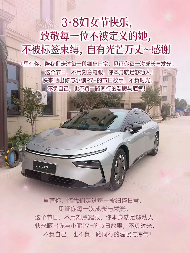 妇女节浪漫氛围图,一辆小鹏P7+停在铺满粉色花瓣的道路旁,车窗半降,一只手从车内伸出,轻触飘落的花瓣。背景是春日盛开的樱花树,阳光透过枝叶洒在车身上,画面清新唯美,传递“不负时光,不负自己”的浪漫与诗意。