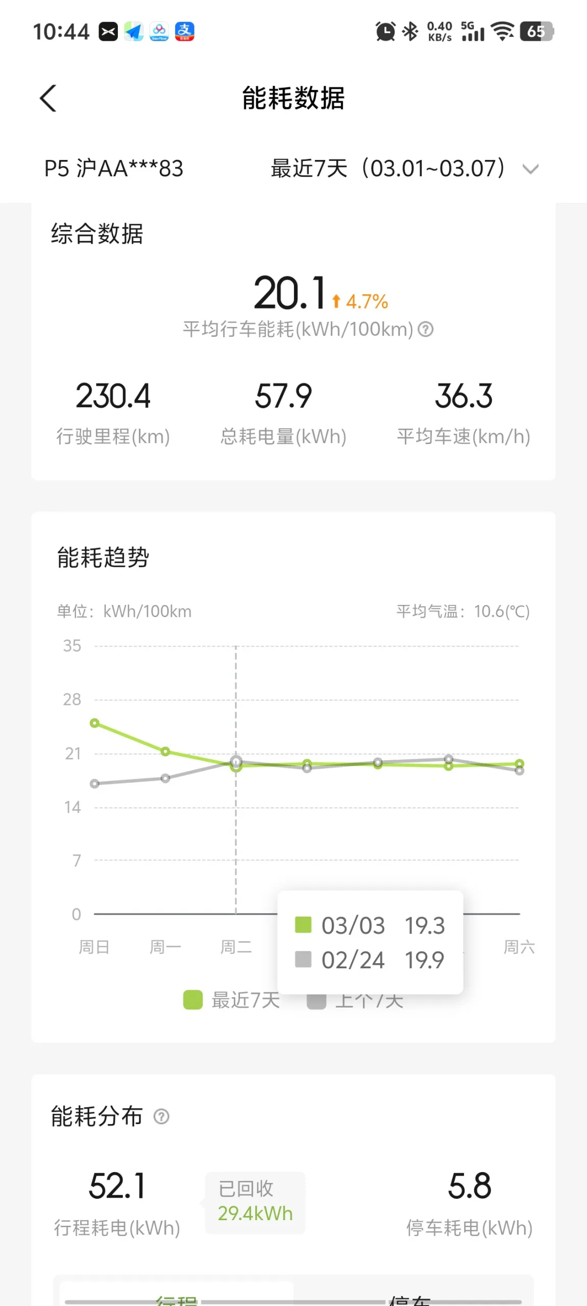 - 总耗电量:57.9 kWh(行程耗电52.1 kWh,停车耗电5.8 kWh,能量回收29.4 kWh)