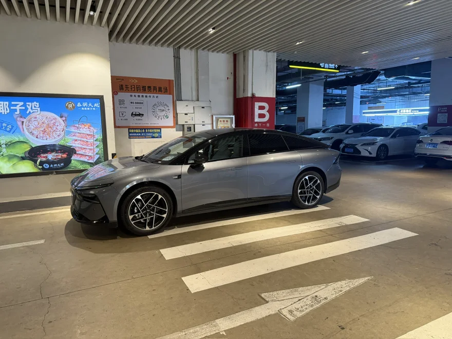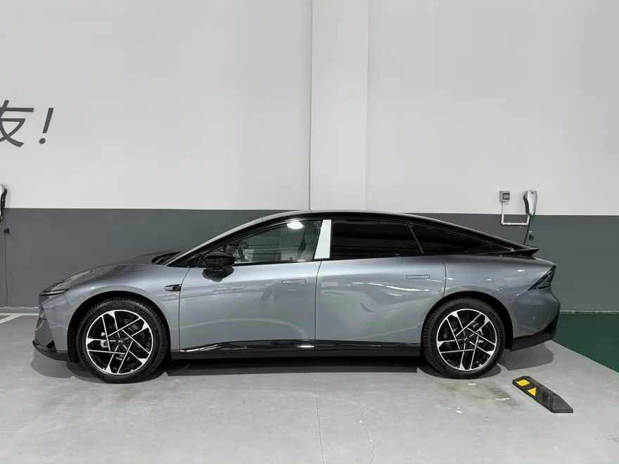 先说说最直观的颜值。我选的是灰色,在阳光下会泛出一种高级的金属质感,无框车门一拉,那种仪式感直接拉满。溜背的线条从B柱开始往下收,配上20寸的运动轮毂,停在路边真的会有人过来问这是什么车。
