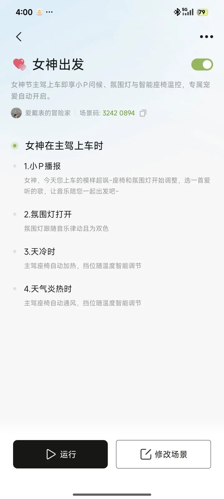 #玩转智慧场景# 今天是女神节,我特意为我的小鹏X9定制了一个专属智慧场景——「女神出发」。坐进主驾的那一刻,场景自动触发,仿佛车也懂仪式感。座椅自动调节到最舒适的位置,氛围灯温柔亮起,轻快的音乐缓缓响起,屏幕上还会出现暖心的问候。 原本普通的出行,瞬间多了一份惊喜与浪漫。一辆懂你、宠你的座驾,不只是代步工具,更是陪伴左右的贴心伙伴。这个女神节,因为「女神出发」,让每一天的启程都充满期待与美好。