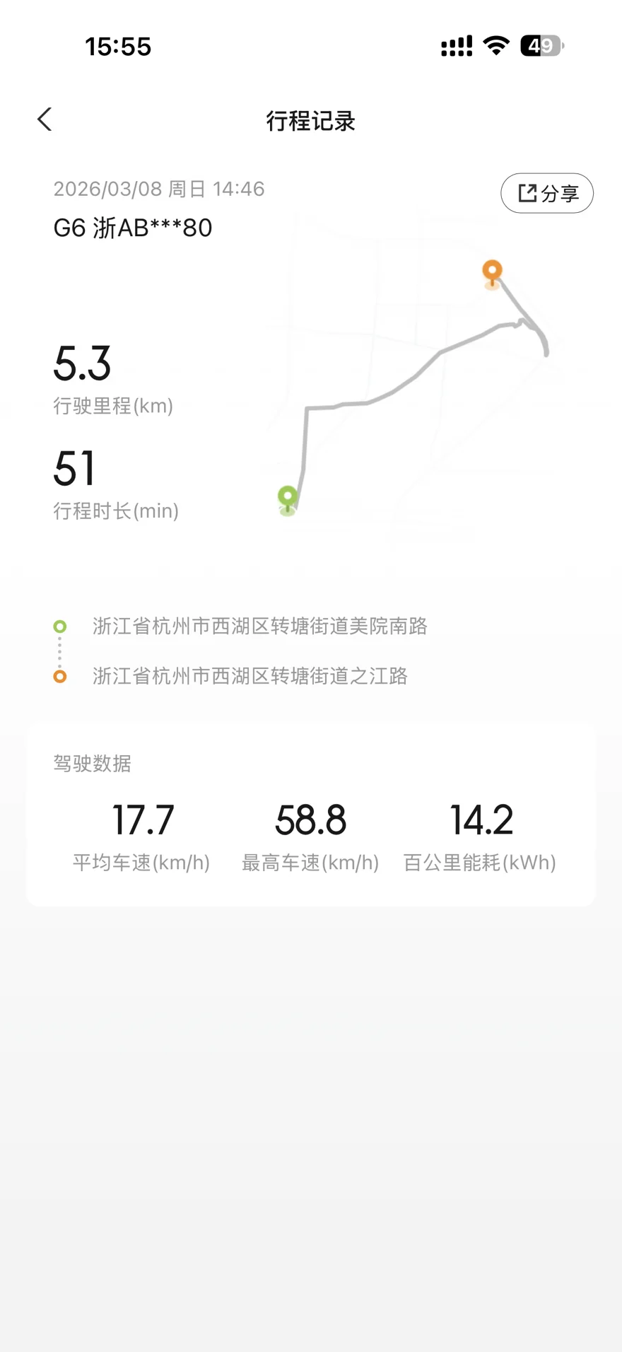 3月8日的单次行程中,虽然平均车速仅17.7km/h,最高车速58.8km/h,百公里能耗仍控制在14.2kWh,我的G6表现稳定。