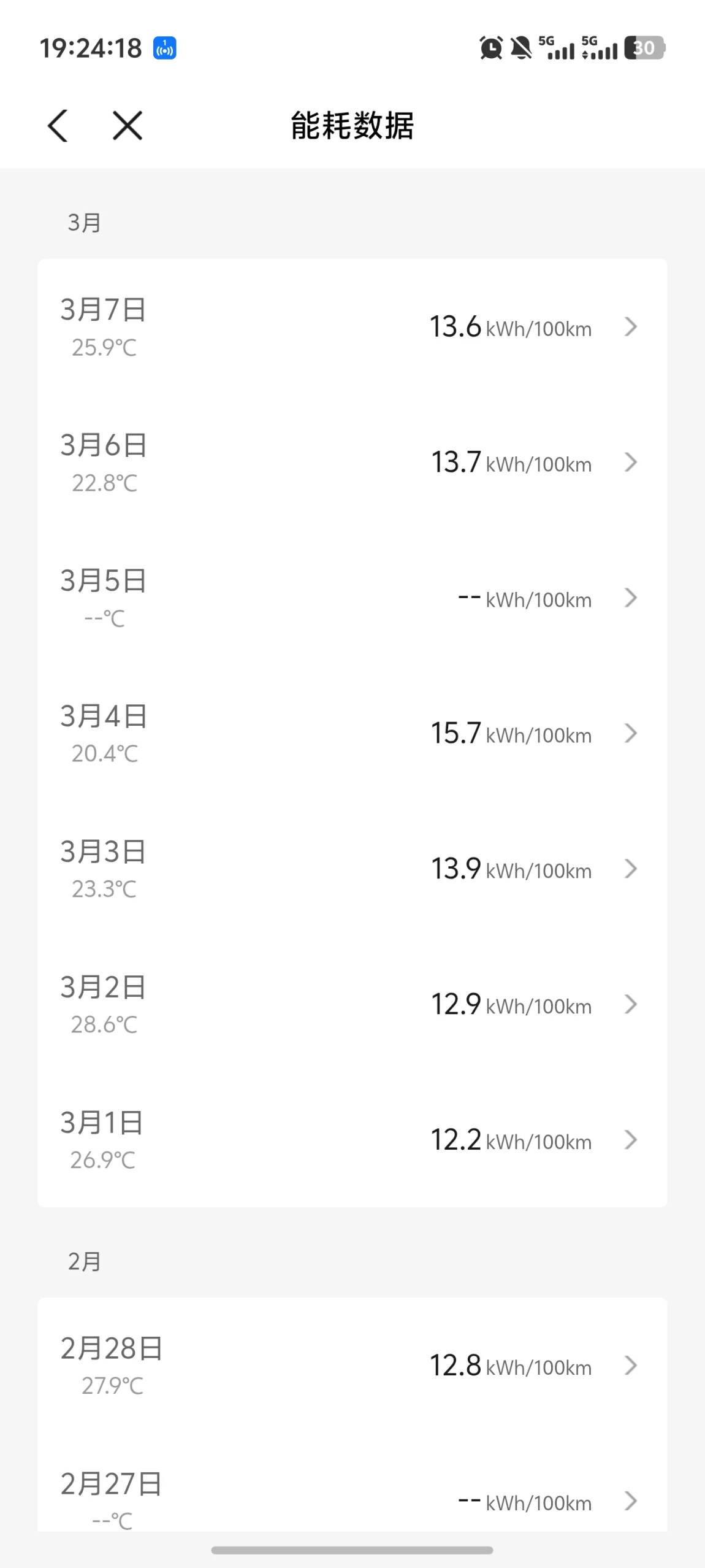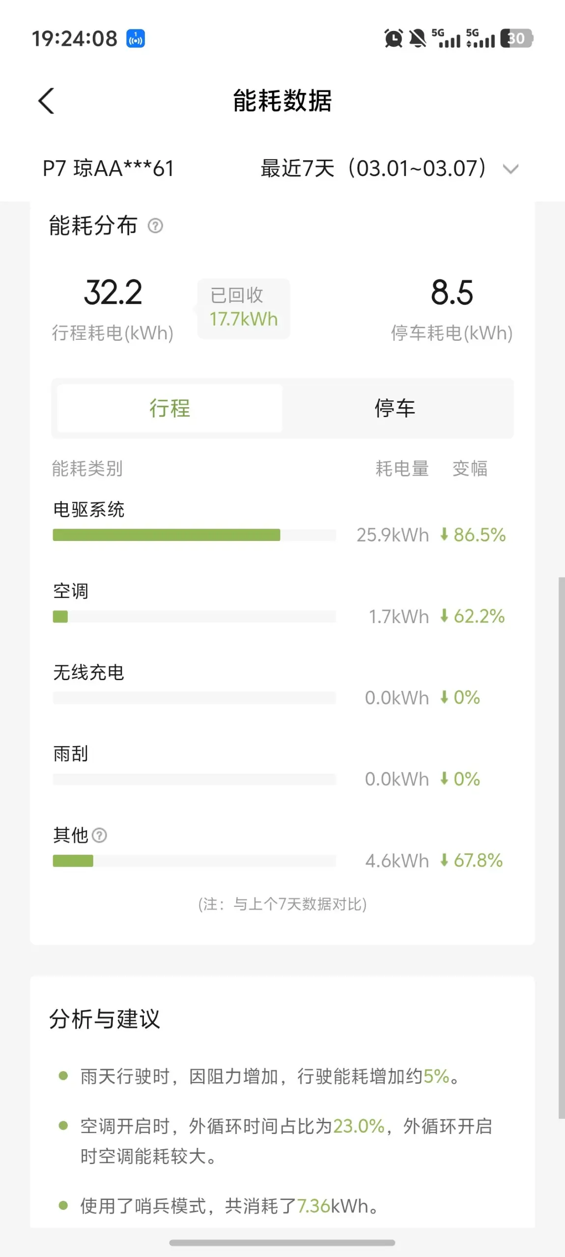 2. 路况影响:3月4日能耗略高(15.7kWh/100km),那天是雨天,路面阻力大,符合系统提示的“雨天能耗增加约5%”。