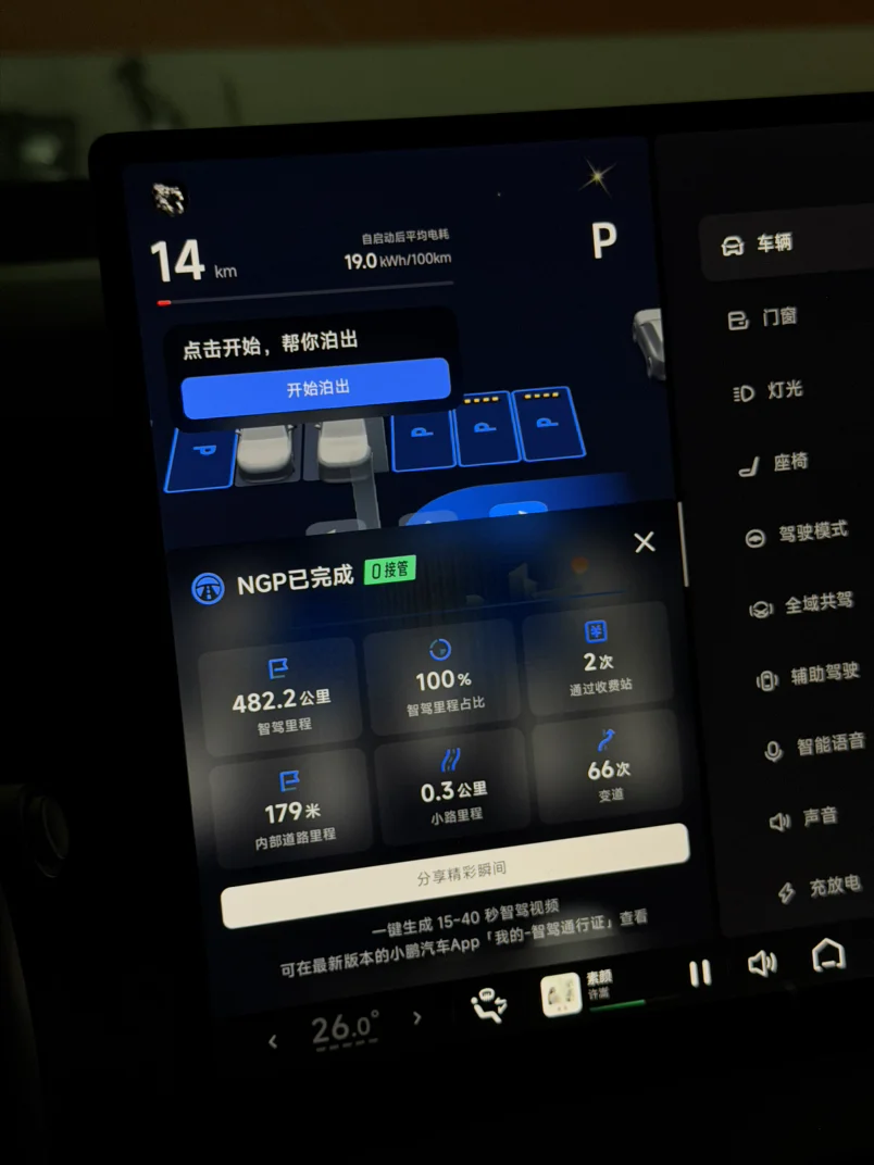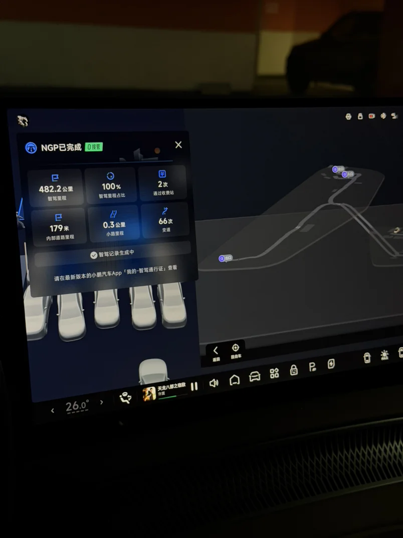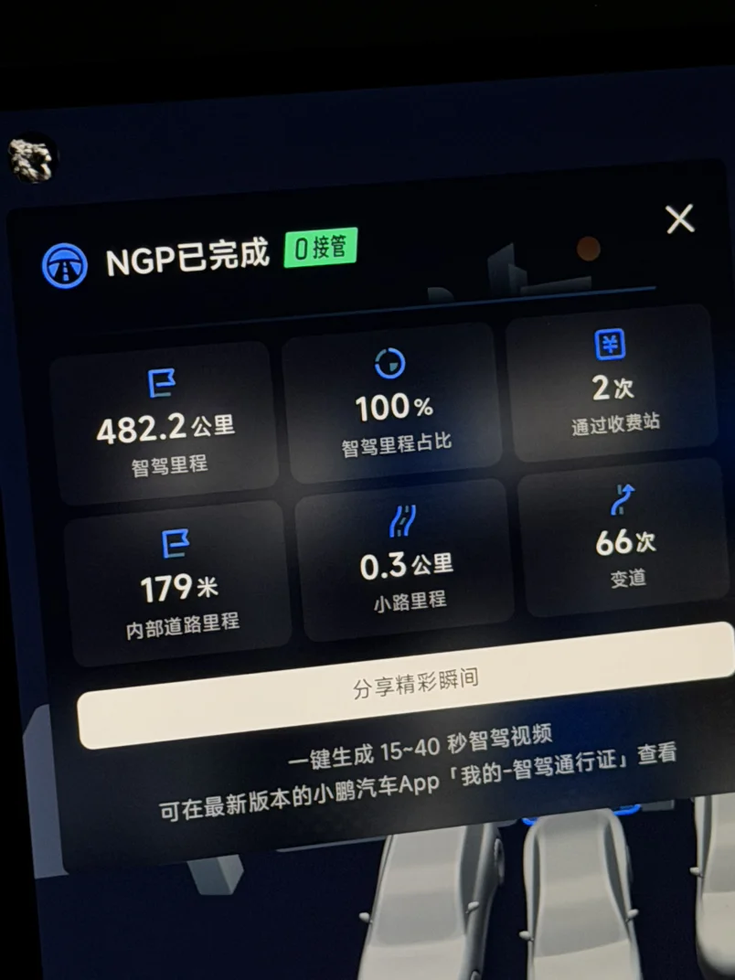 小鹏最长纯电0接管记录,100%NGP,一次都没接管,只需要坐着看路,喝喝水,补充补充吃的就到了,续航也够顶,前面还开了5.1km,去客户公司,其实总里程487.3km,剩14kmWLTP,3%的电。一口气5小时,最高124码,均速95,堵车15分钟,不然480km不用5小时,效果可以了。所以这年头在南方还有必要开油车吗?10℃的晚上,一口气482.2km,走的时候98%的电,到家还有3%,台州-无锡,5小时不停,充电在普通180kw桩也能38min充满,还买油车真的是没苦硬吃……[破涕为笑]小鹏汽车辅助驾驶数据,尽在掌握