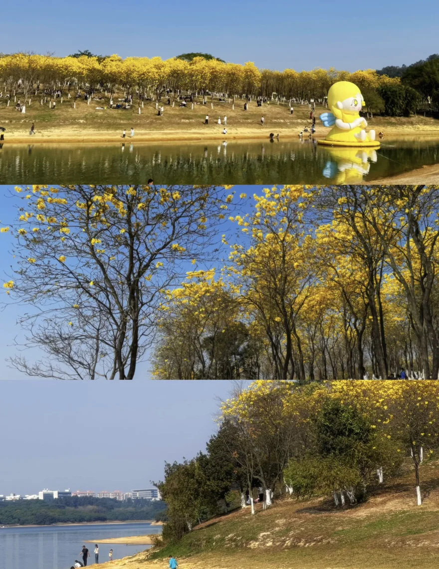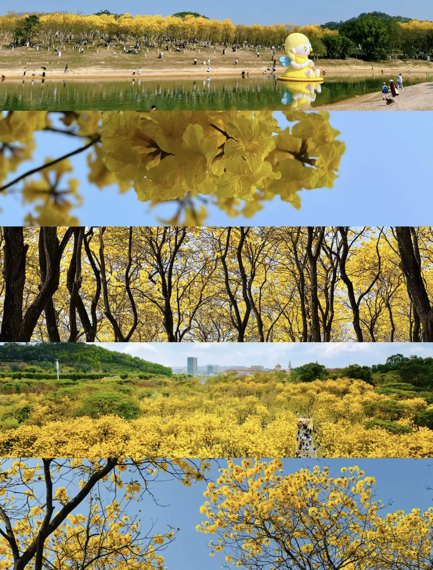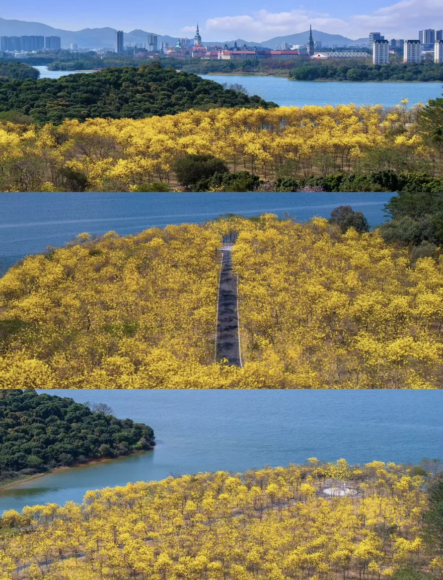 抵达松山湖,远远望去,黄花风铃木如一片金色的海洋,在阳光下肆意绽放。我将车停在路边,没有刻意让它与花海同框,而是让它安静地成为我春日记忆的背景。漫步在花树下,风拂过,花瓣簌簌落下,空气中满是清甜的气息。