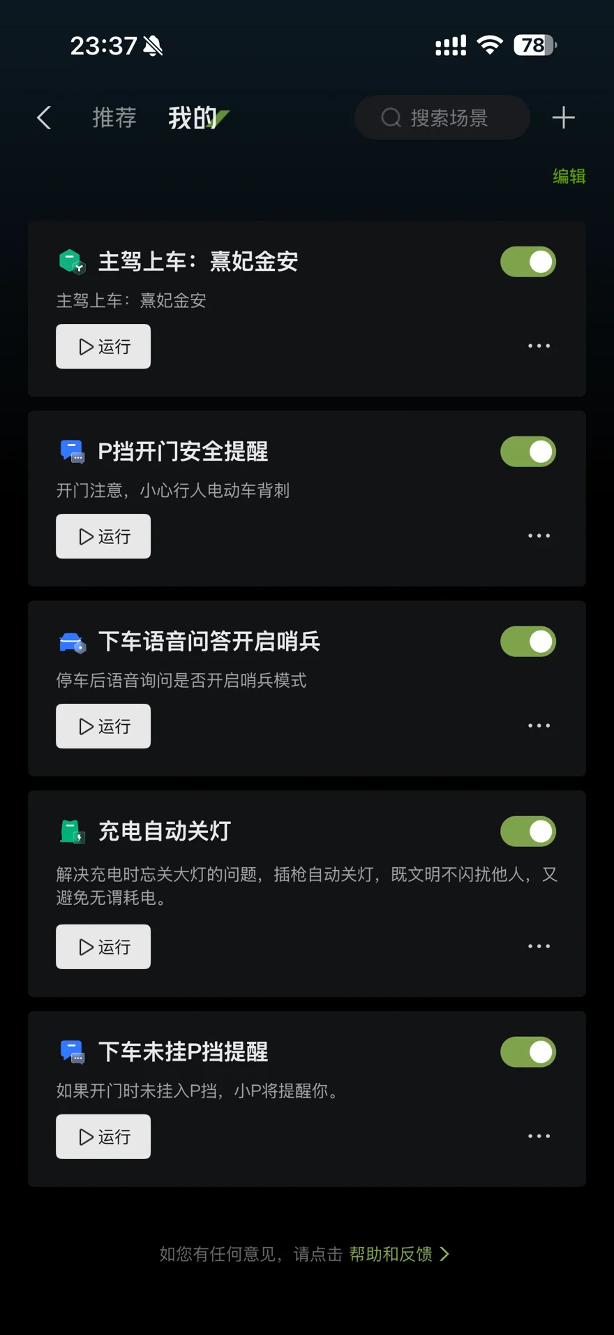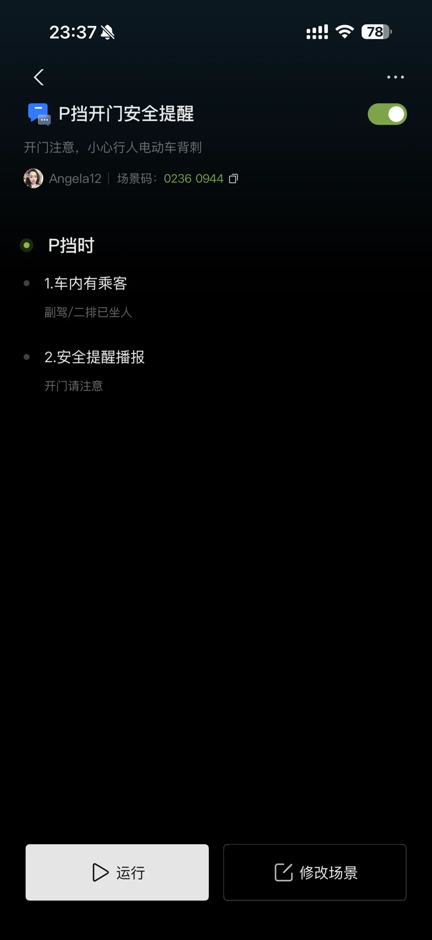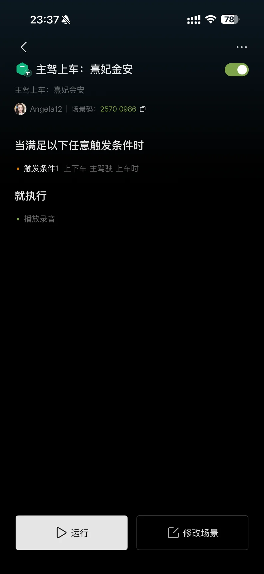 这个场景的触发条件是主驾上车,执行动作是播放我提前录好的专属语音。每次坐进车里,听到这句问候,一天的疲惫都被治愈了,仿佛自己就是被偏爱的女主角。