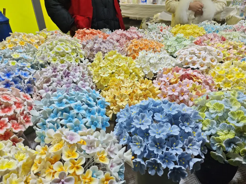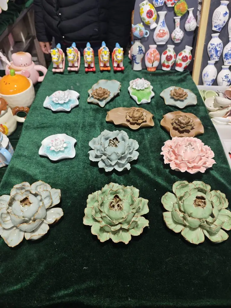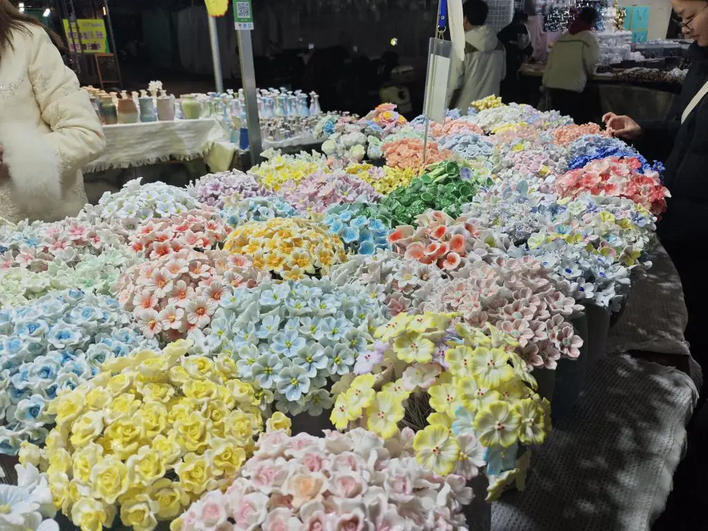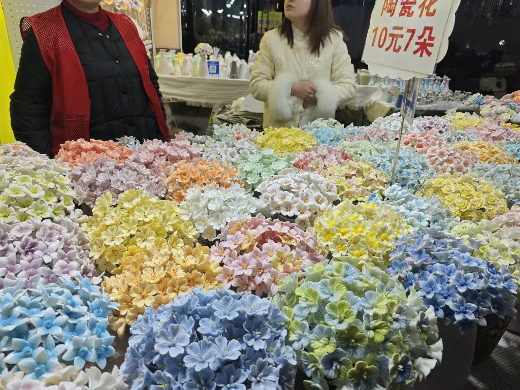 #小鹏影像记录家# 开着小P从无锡晃到景德镇,本来是想看看瓷器,结果在陶阳新村的夜市被这些陶瓷花绊住脚了奶白、鹅黄、雾蓝…每朵都带着釉面的润感,10块钱7朵,挑得我眼花缭乱。把车停在古街边上,透过车窗看青花和繁花凑在一起,突然觉得,这趟慢悠悠的自驾,比赶任何景点都舒服。