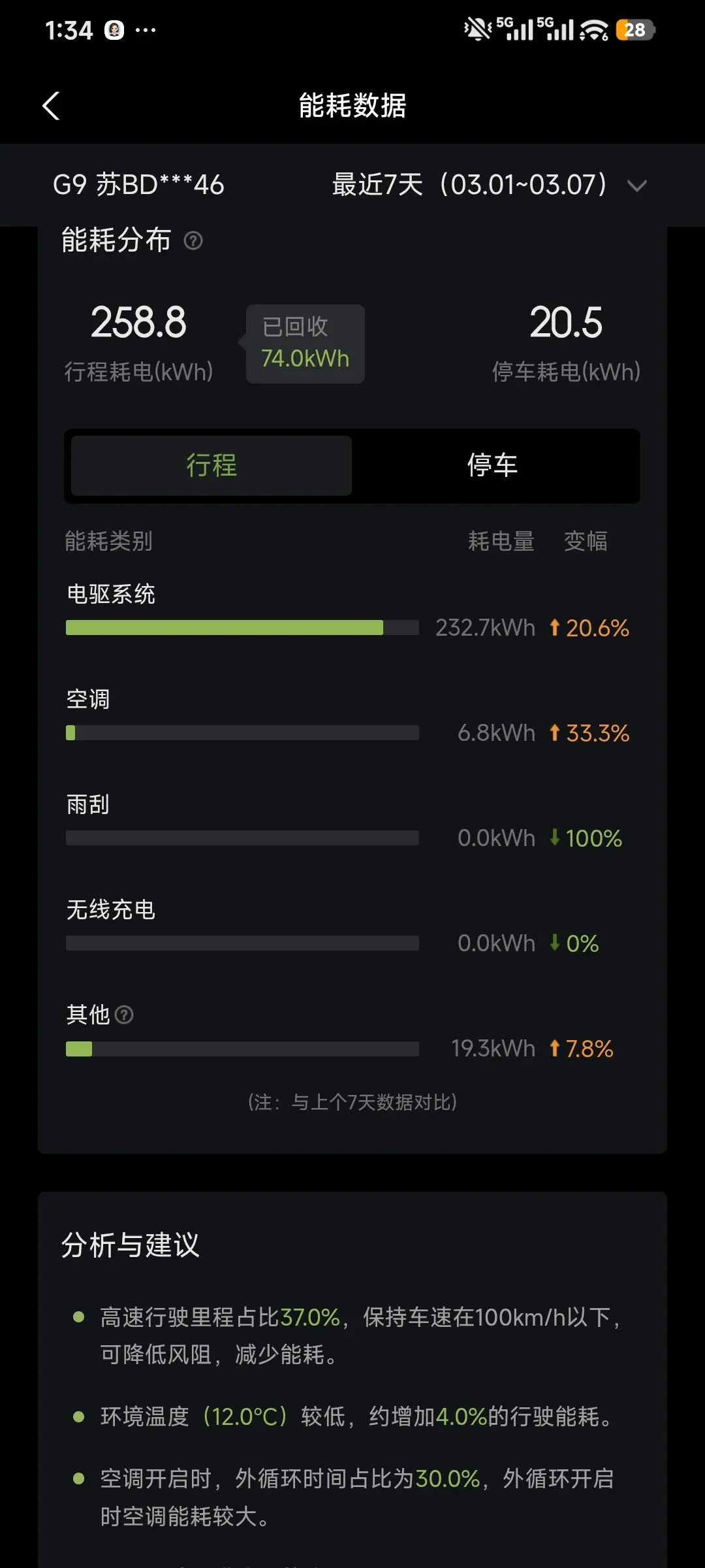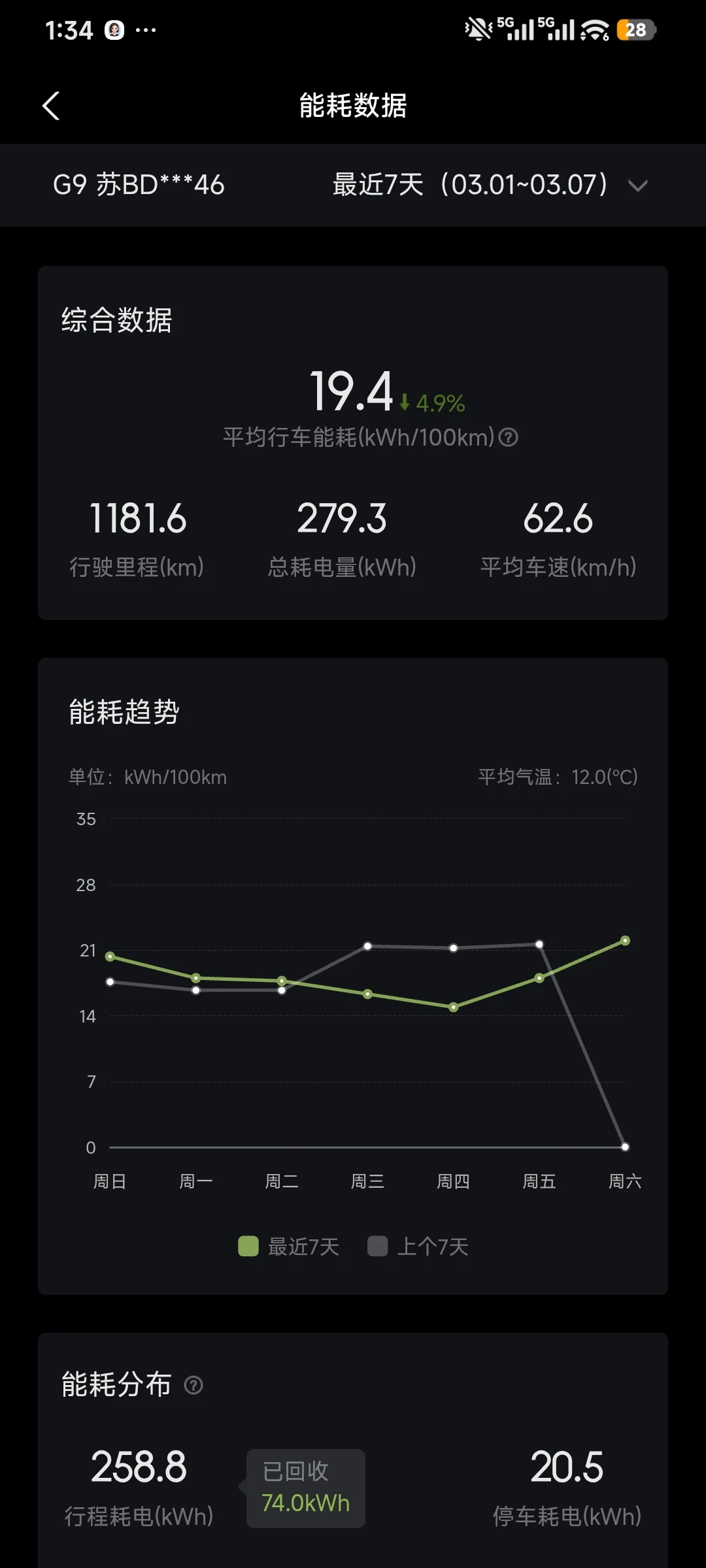 #能耗报告# 这七天开着G9疯跑了1181公里,从无锡一路干到南昌、景德镇、铅山,平均能耗19.4,还比之前降了点,属实意外!高速基本都靠NGP稳在100左右跑,风阻小了电耗自然就下来了;春天温度舒服,空调也不用死命开,能省一点是一点。纯电跑长途也没在怕的,脚法稳一点,习惯好一点,续航焦虑根本不存在~