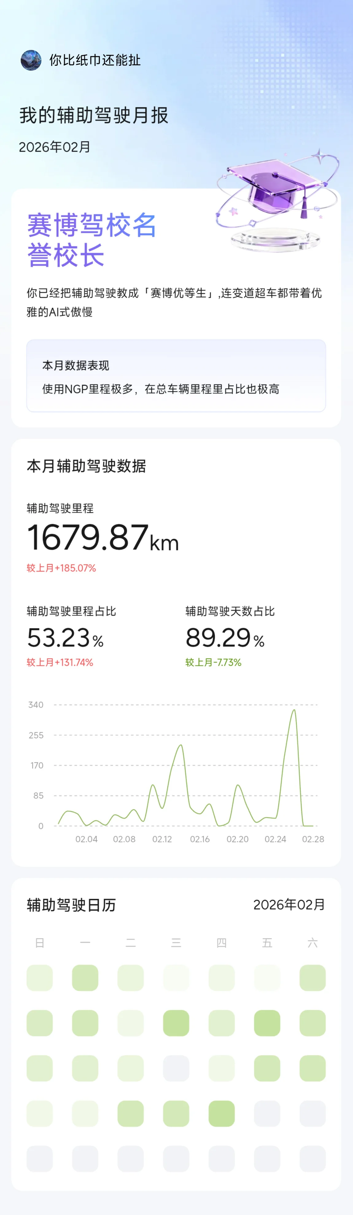 #我的辅助驾驶数据# 辅助驾驶用了85天,94%的日子都在开,累计3617公里,自动泊车154次,喜提「赛博驾校名誉校长」称号✅