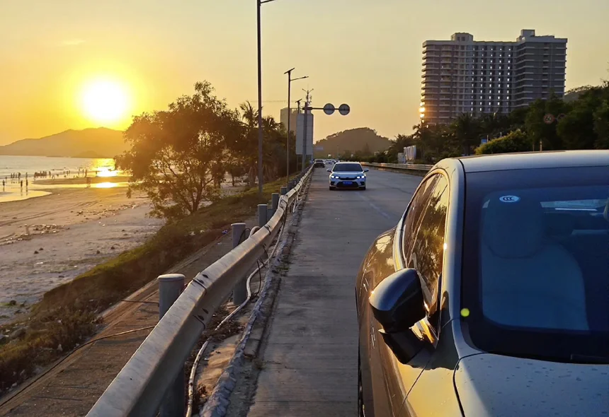 这是一张存货,我觉得这个构图太美了!落日余晖的海滨大道!