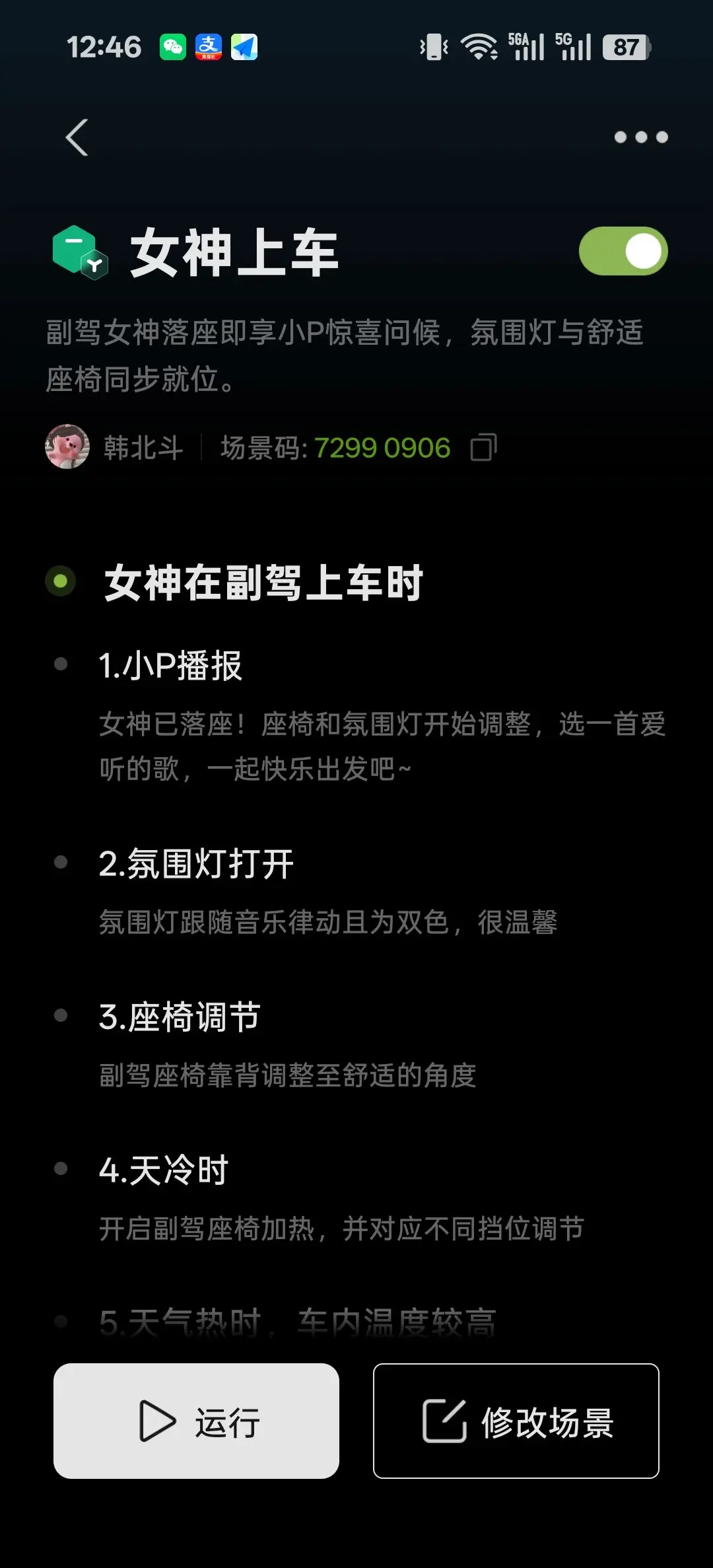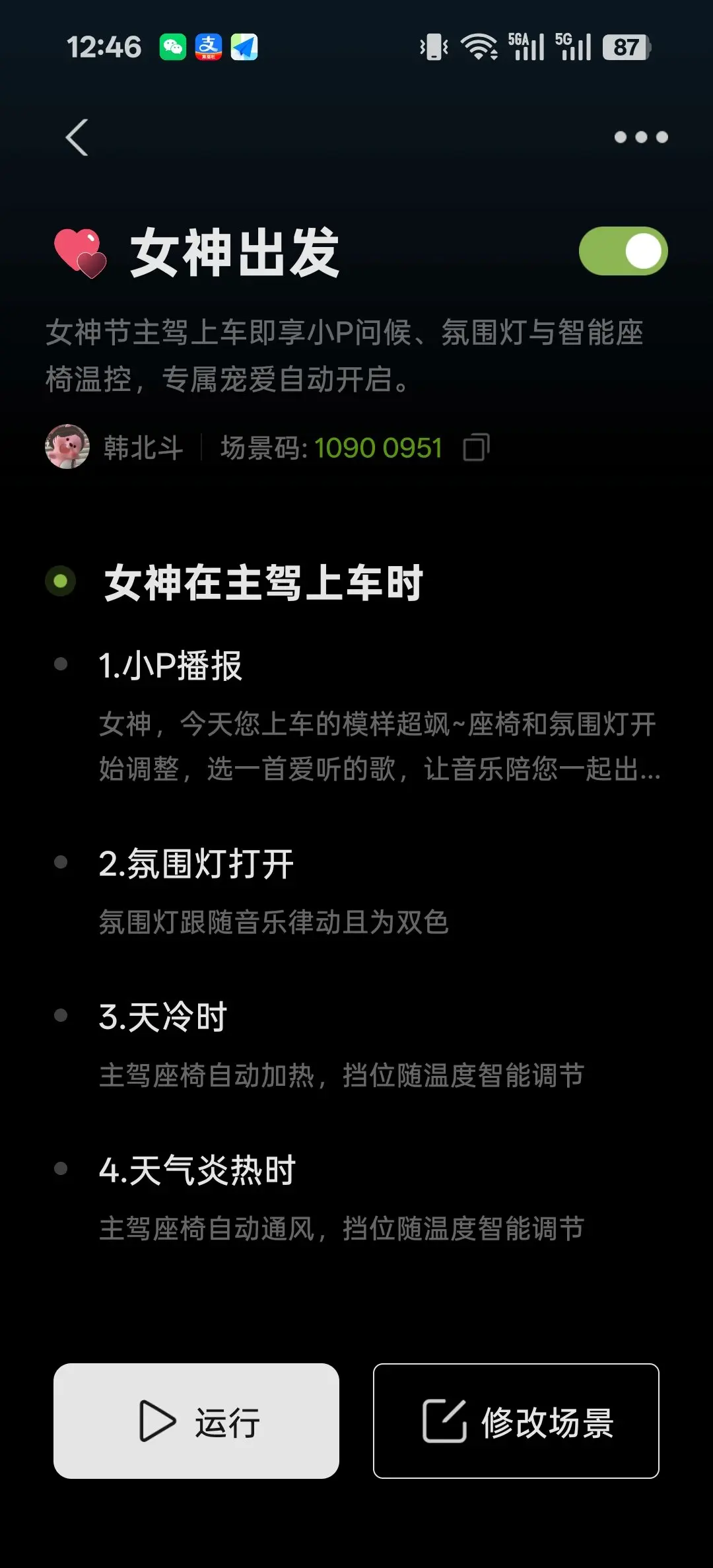 女神节到了,设置了两个女神节专属智慧场景,让女神们无论是紧握主卧方向盘还是坐在副驾享受旅程的时候都能感受到温暖❤️