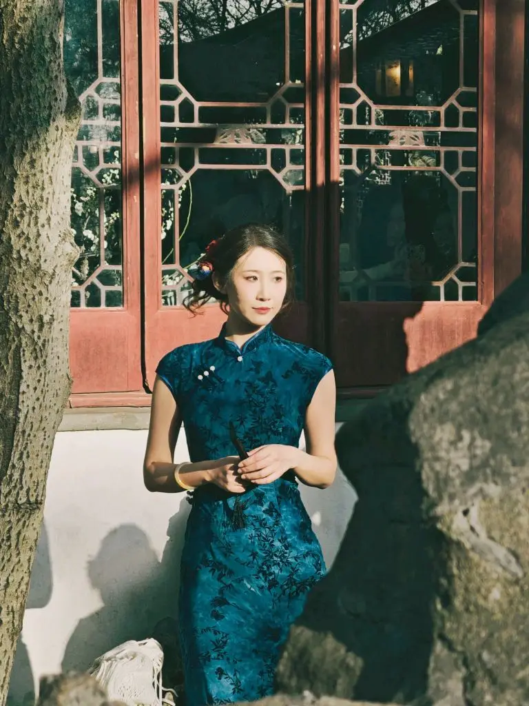 - 一袭墨绿旗袍,在光影里定格成一幅复古的画。