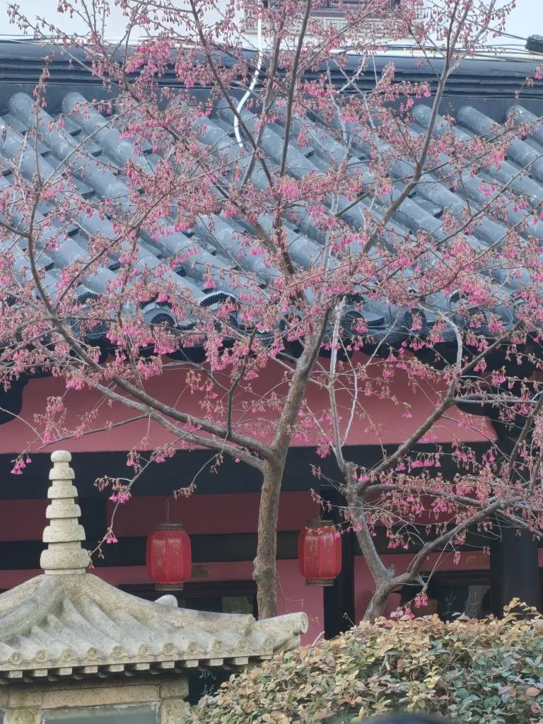 - 古寺的红墙下,梅花初绽,是春天最温柔的信笺。