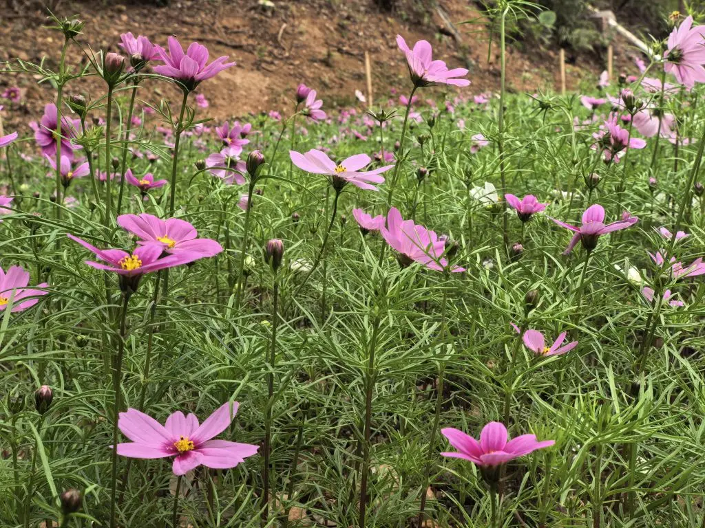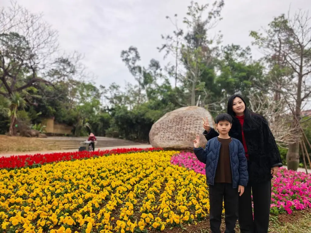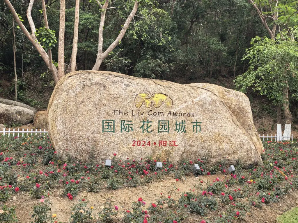 刻着“2024·阳江”的巨石旁,玫瑰开得热烈奔放,红瓣缀满枝头,在风里漾起温柔的涟漪。拾级而上,粉紫格桑花漫山遍野,纤细茎秆托着轻盈花瓣,像灵动的精灵在阳光下起舞。再往前,黄、红、粉三色堇铺成斑斓花毯,明艳得晃眼,将春日的活泼与明媚尽数展现。