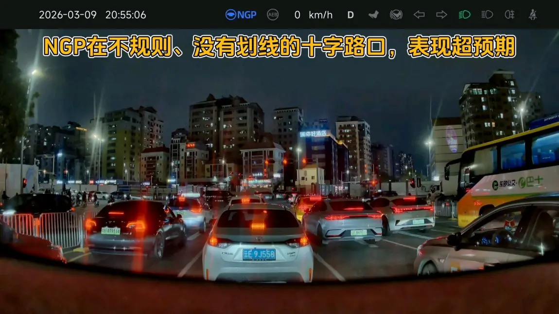 晚上照明条件不太好的情况下,在不规则的没有标线的十字路,NGP表现的像老司机,稳~
