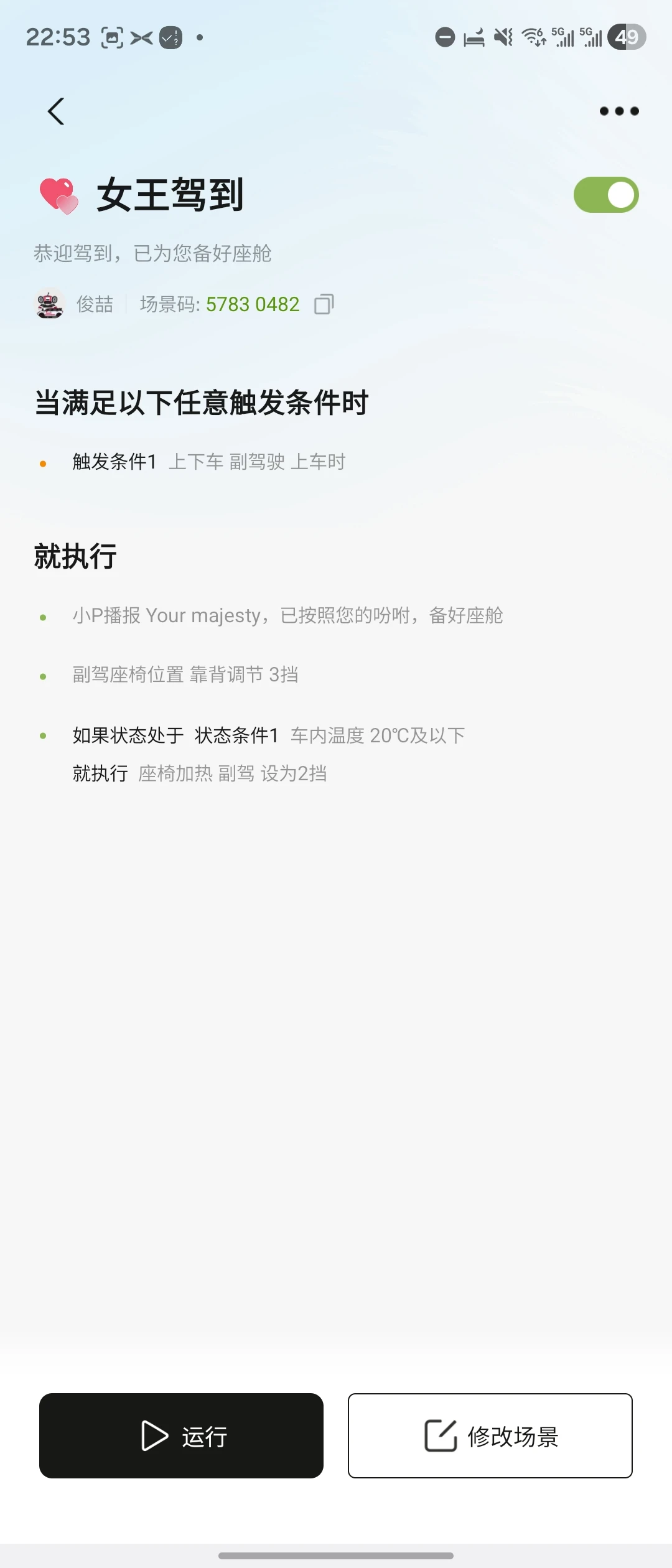 #玩转智慧场景# 玩转智慧场景|女神节限定,把“女王驾到”装进车里💖女神节的仪式感,从副驾的专属智慧场景开始。为我的小鹏MONA M03设置了「女王驾到」场景,场景码:5783 0482,一键解锁温柔治愈的出行体验每次女神拉开车门,迎接她的不仅是一句俏皮的问候,更是提前调好的舒适座椅和恰到好处的温度。用科技把爱意藏进细节,让每一次出行都充满仪式感!