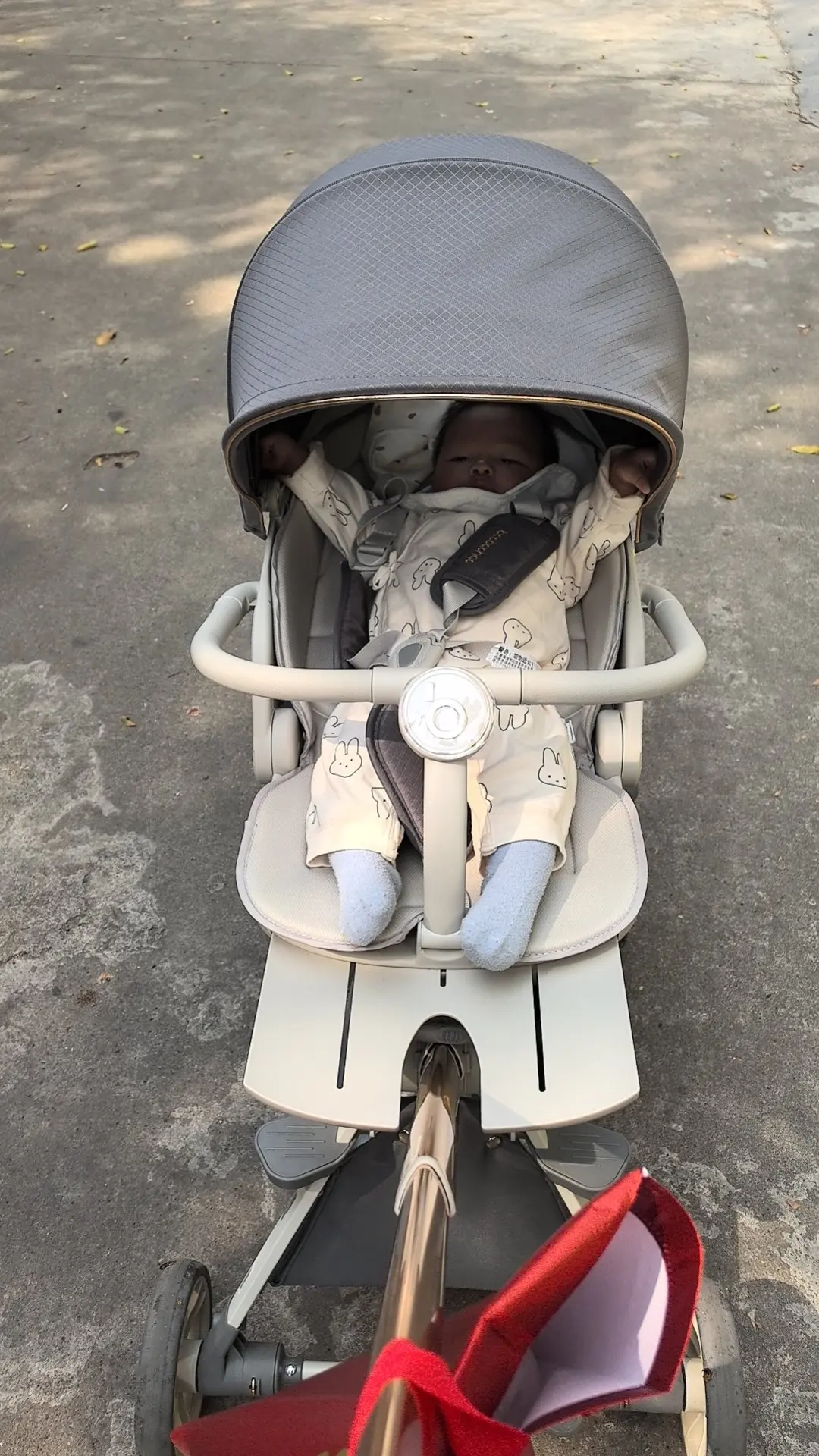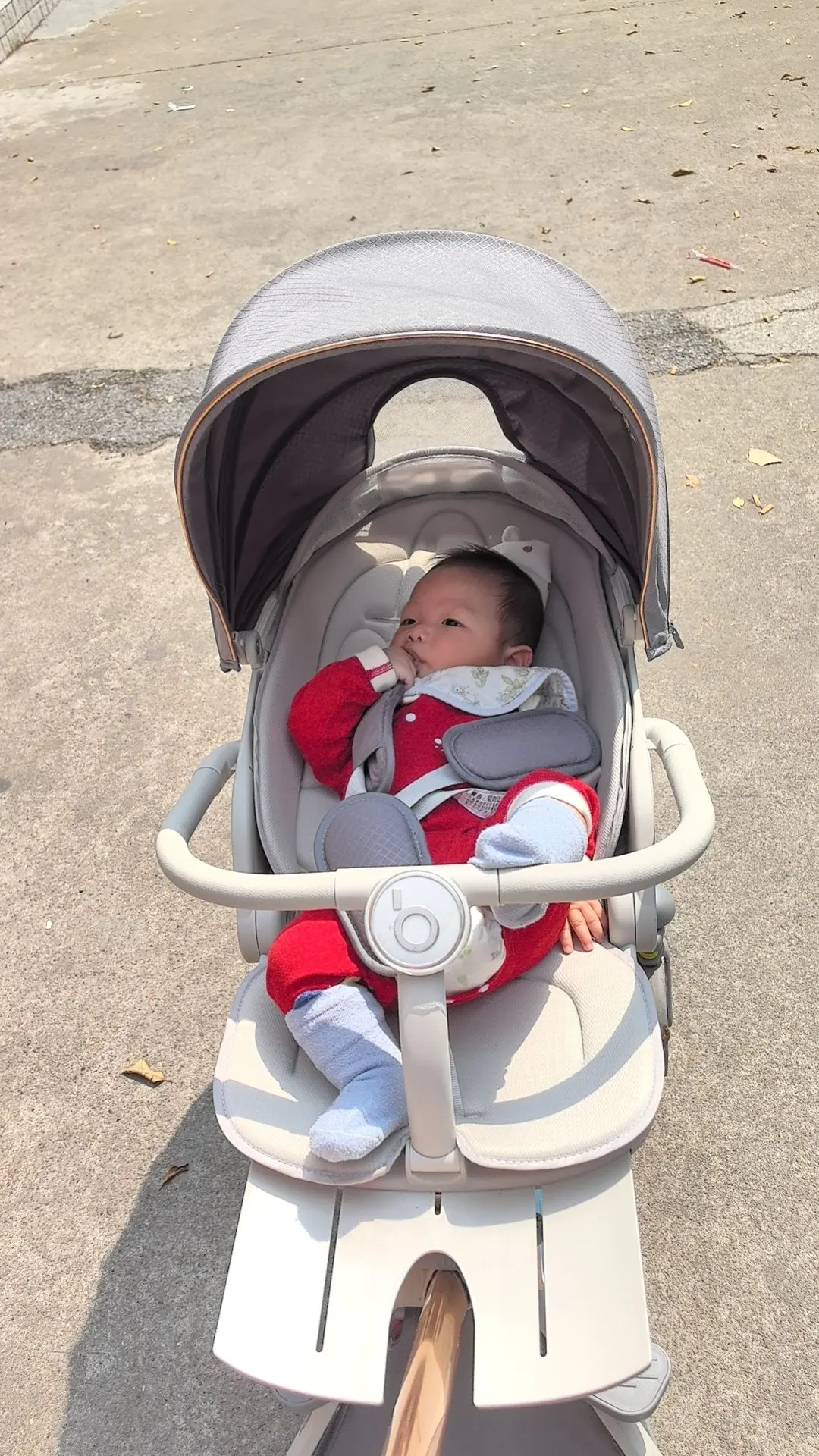 图1 & 图2: 出门前的小小仪式感。把宝宝安安稳稳地放进他的“座驾”里,检查安全带,调整遮阳篷。他举起小手,仿佛在回应窗外的阳光。这些细碎到几乎被忽略的日常,构成了我作为母亲最坚实的幸福基底。