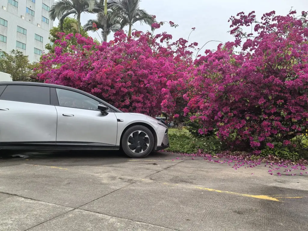 图4: 抵达目的地。将P7+停好,回头便撞见一丛怒放的鲜花,与金属质感的车身刚柔相济。就像我们的生活,既有科技带来的便捷与冷静,也有自然赠予的浪漫与热烈。