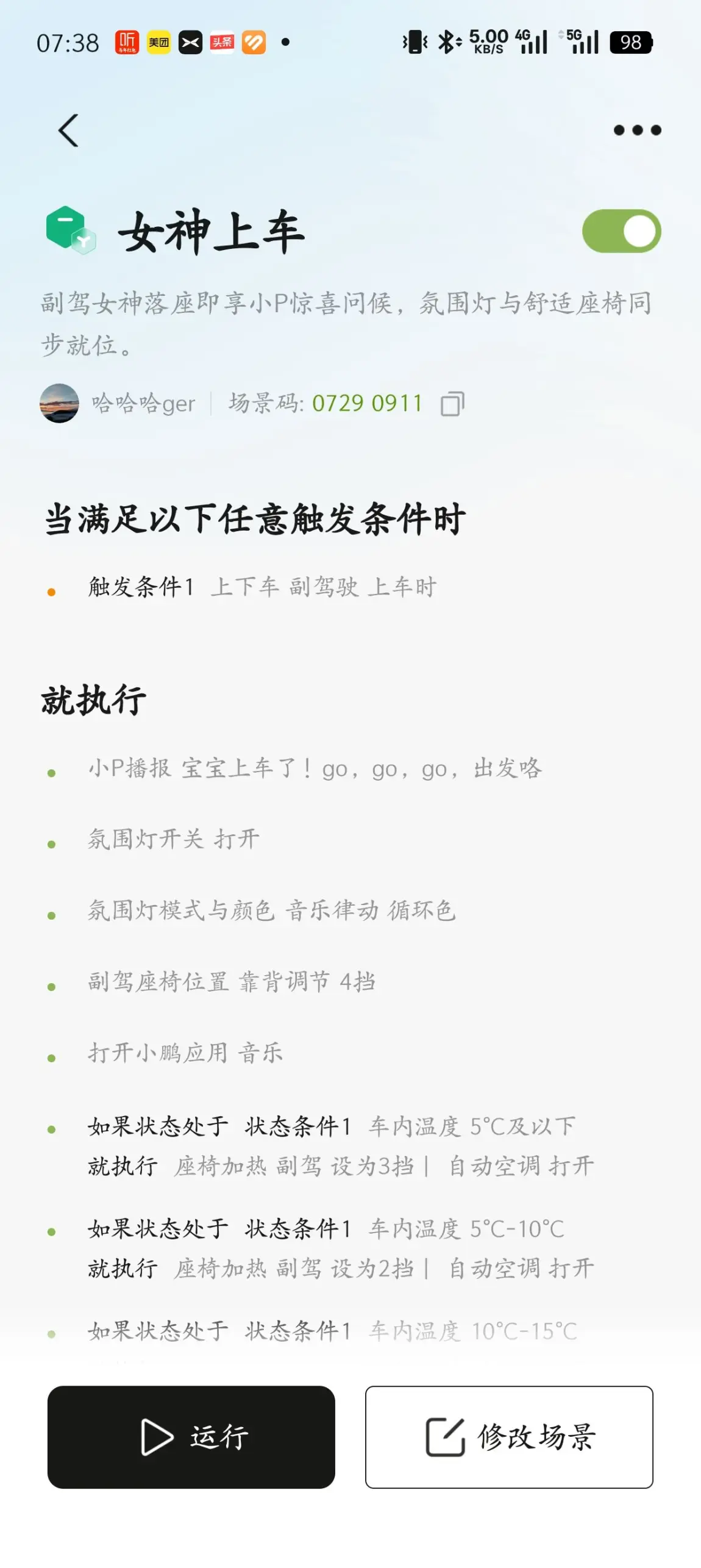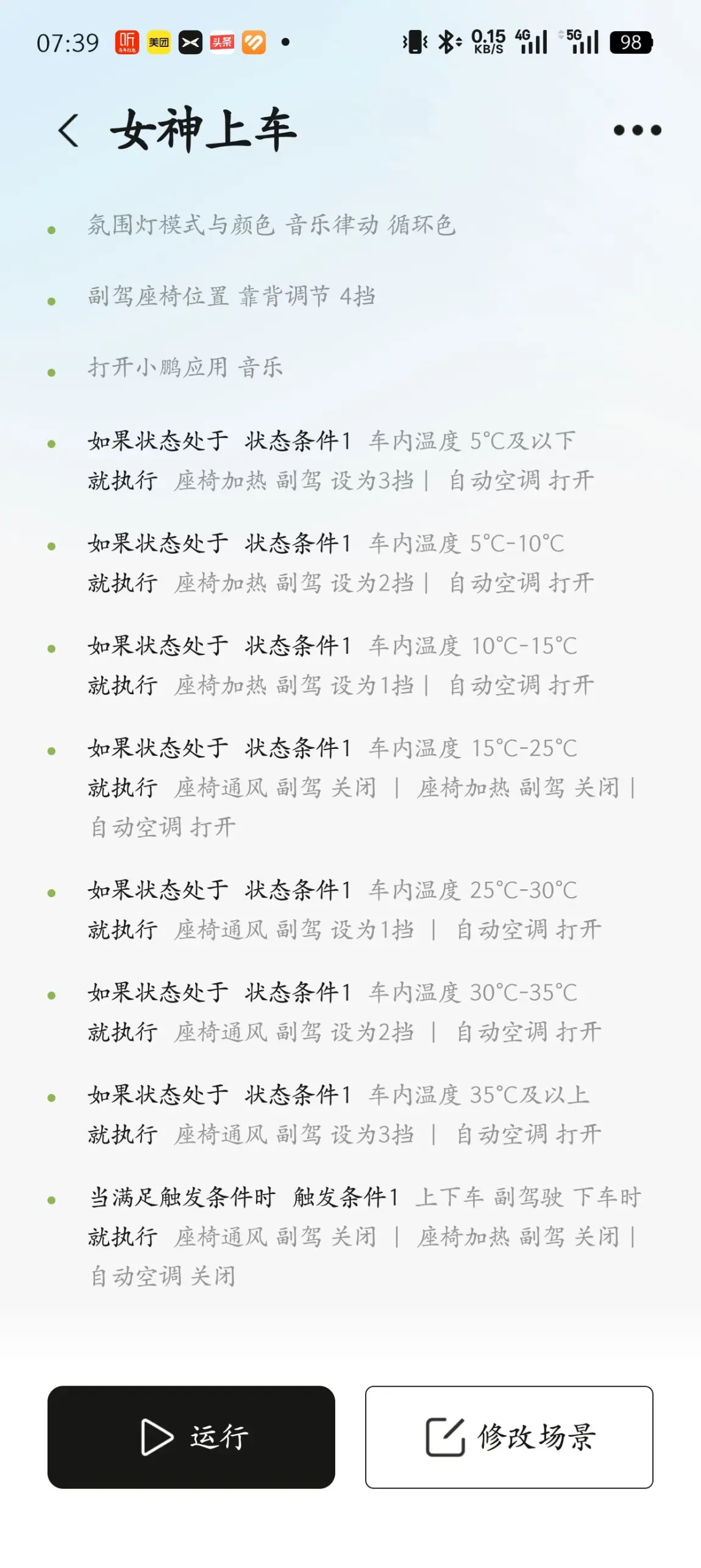 #玩转智慧场景# 女朋友的智慧座舱!我和女朋友都是普通的上班族,每天上班我俩一起出发,下班时间差不多的话就接她一起回家,在路上诉说着今天发生的各种琐事。也只有在车里的这段时光,才是属于打工人自己的时间。不过自从知道可以设置智慧场景后,女朋友的幸福感又提升了不少,每天在女朋友上车后,就先给他播报一下出发咯,系上好全带后,座椅加热与通风,还有空调自动打开,配合着喜欢的氛围灯颜色,享受着耳边的音乐,美哉美哉。