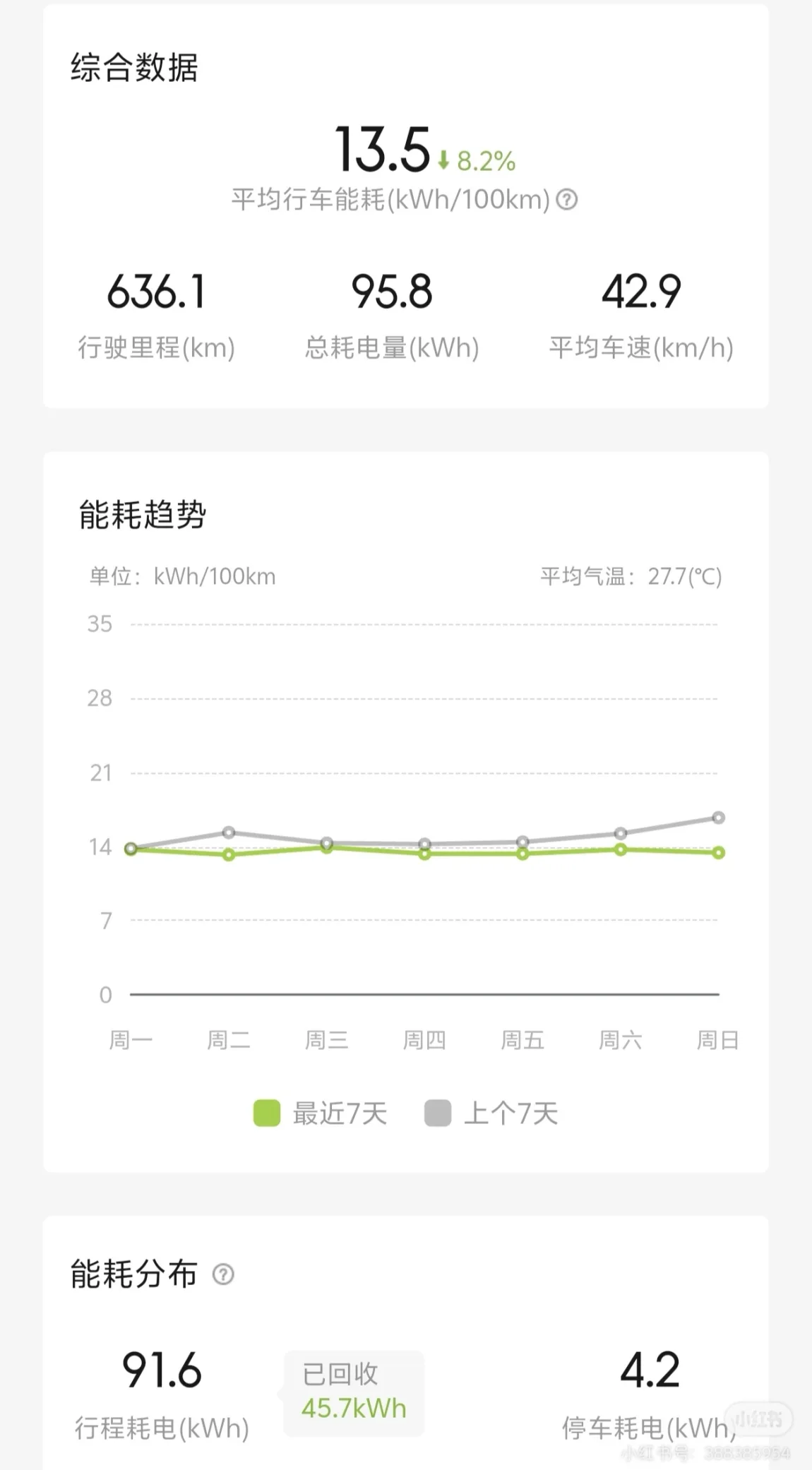 能耗:行车能耗13.5左右,但这个不准确,只统计了车速>0的电耗,等红绿灯和停车的时候没统计进来,看行程电耗一共91.6度电,行驶636公里,真实的综合电耗是14.4,跟官方标准的综合电耗基本一致