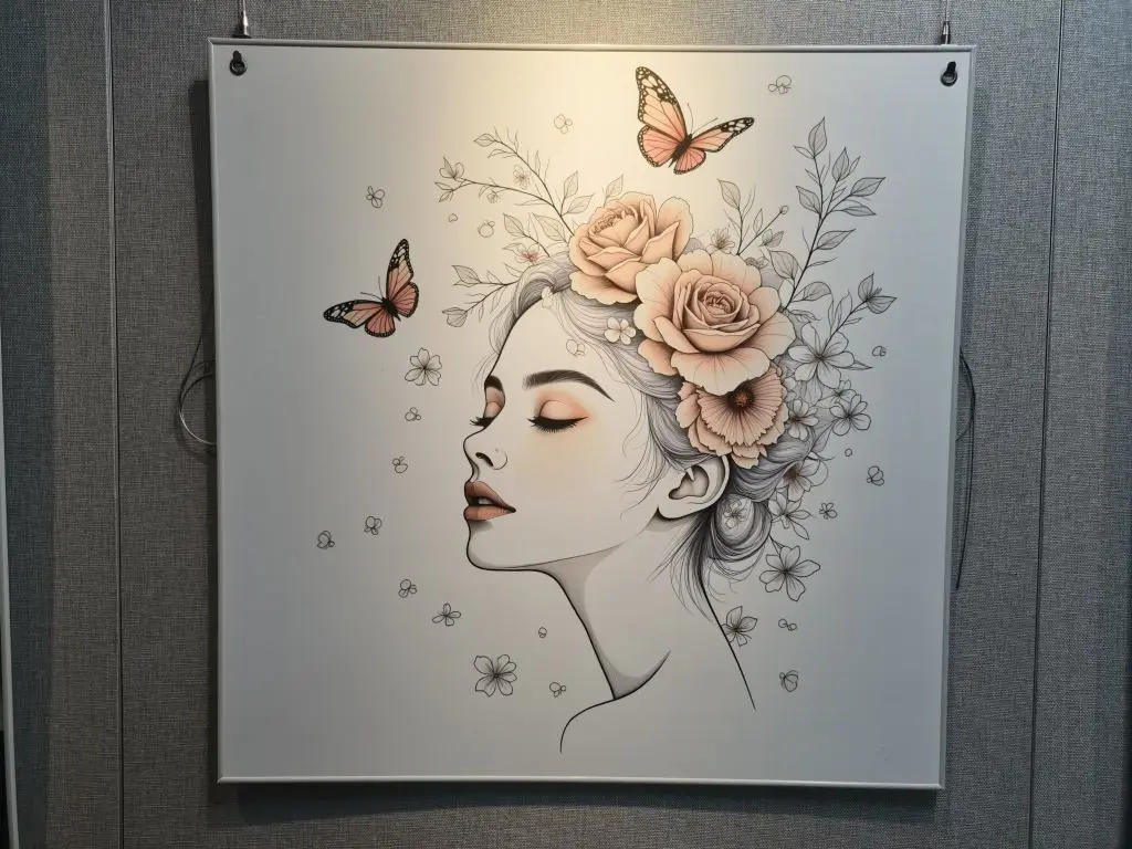 - 花与蝶的温柔:闭目的女子被玫瑰与蝴蝶环绕,线条干净柔和,暖色调晕染出静谧的美好,像在诉说“温柔自有力量”。