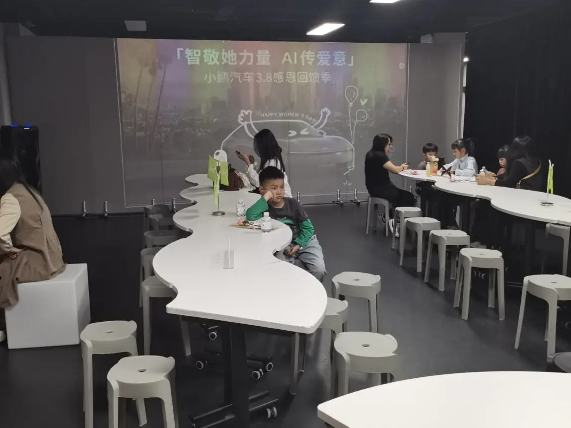 没有冰冷的商务感,取而代之的是错落的画作、舒适的弧形桌椅,连地面都印着趣味互动指引。小朋友们可以在开阔区域奔跑,大人们围坐交流,空间的温度感拉满。小鹏把“家”的理念融入场地细节,让每一位参与者都能卸下疲惫,沉浸式感受艺术与科技的碰撞。