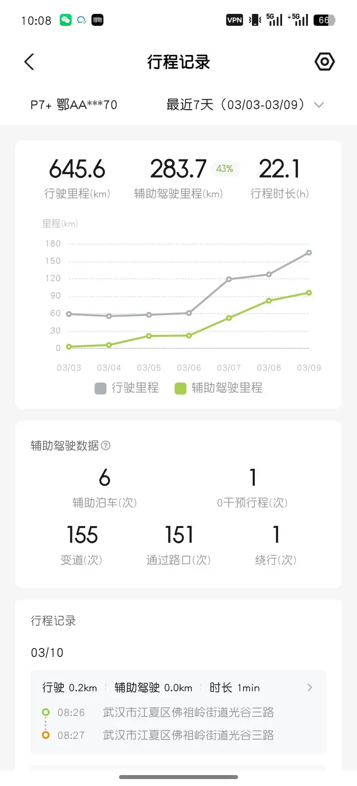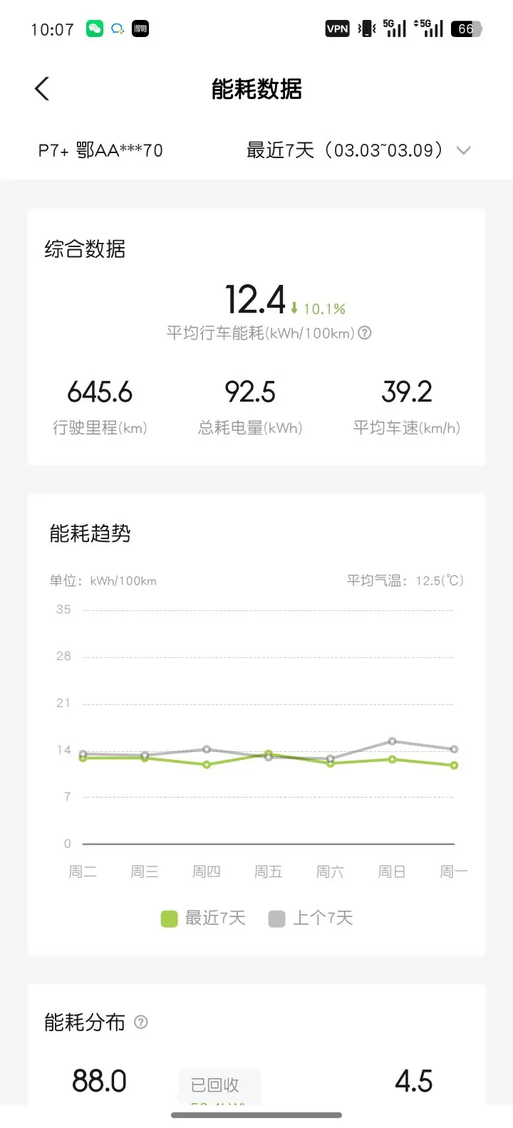 - 日常通勤设为“强回收”(P7+支持三级回收),松电门时车辆减速更明显,回收电量更多。近7天日均回收电量2.4kWh,相当于“白赚”约15km续航。