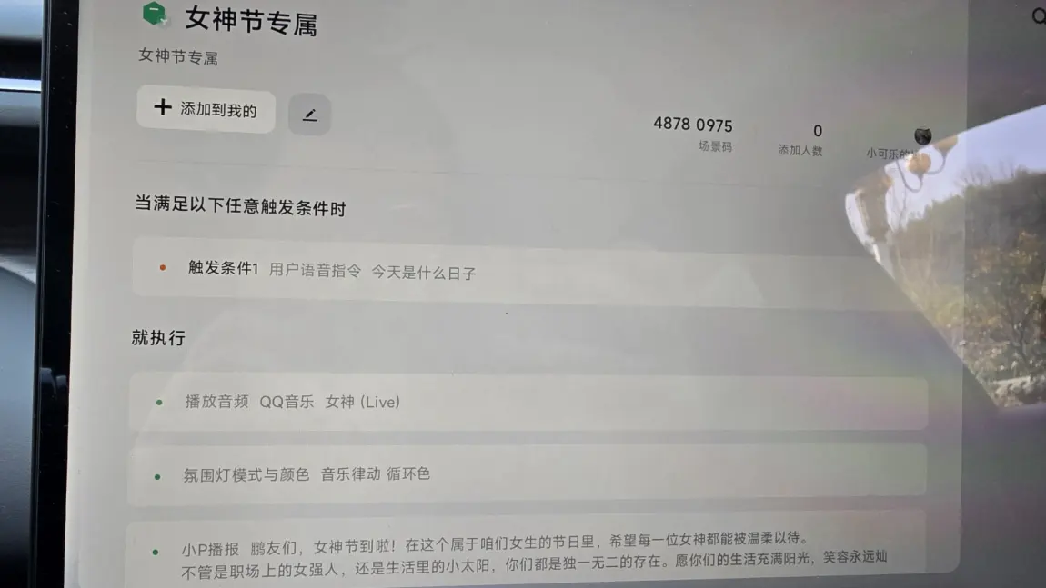 #玩转智慧场景# 3·8女神节|用小鹏G7的智慧,给她专属浪漫💐三月八日,为我的女神准备了一份藏在车里的惊喜——提前使用了小可乐的妈妈创作的智慧场景:坐进小鹏G7的瞬间,座椅自动调节到她最爱的角度,温柔的香氛缓缓弥散,歌单切到她循环的那首歌,屏幕亮起「老婆,节日快乐」的暖光字幕。载着她驶向春日山野,流媒体后视镜里映着她笑眼弯弯的模样,漫山山花在身后铺成温柔背景。智能辅助驾驶让我能安心牵住她的手,把细碎的爱意藏进每一段旅途。这是属于我们的3·8限定浪漫,用小鹏G7的智慧,把日常过成诗✨