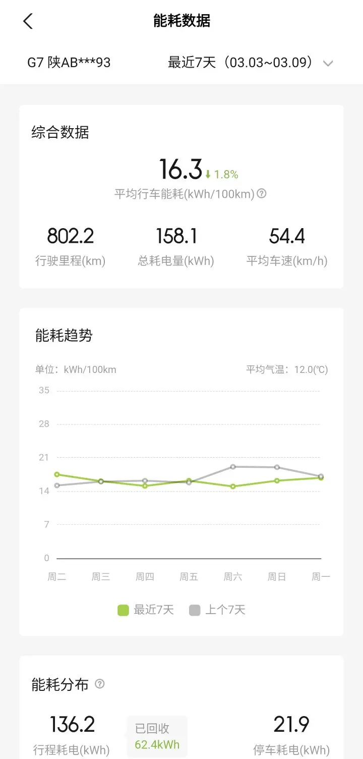 最近7天平均气温12℃,综合行车能耗稳定在16.3kWh/100km,比上周期还降了1.8%,这个表现我真的很满意!总耗电158.1kWh,其中行程耗电136.2kWh,还回收了62.4kWh,停车耗电仅21.9kWh,节能效率拉满。
