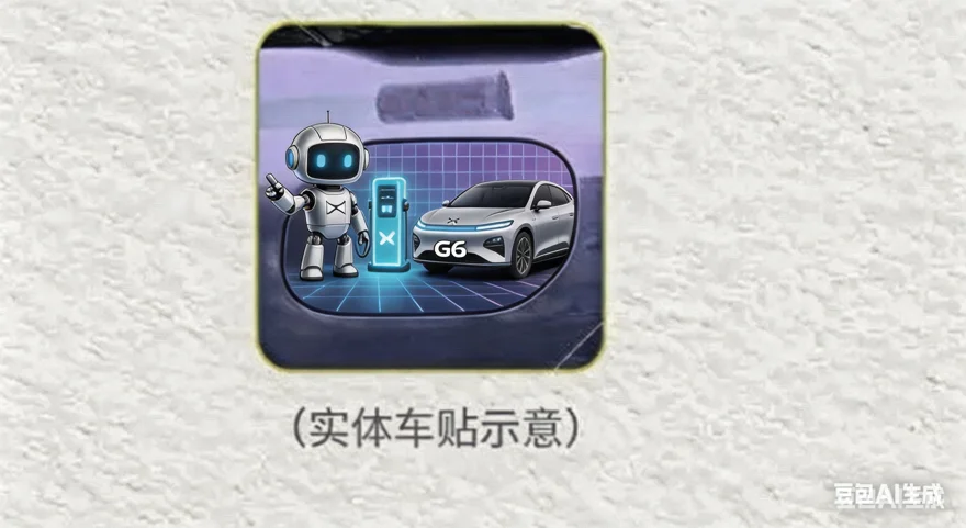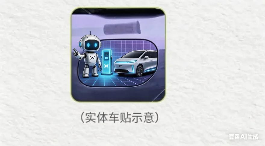 背景以科技感网格铺陈,光效线条串联车、桩与机器人,方寸间勾勒出「人-车-能源-智能」的未来出行生态,既彰显小鹏智电科技实力,也让车贴成为流动的品牌名片。